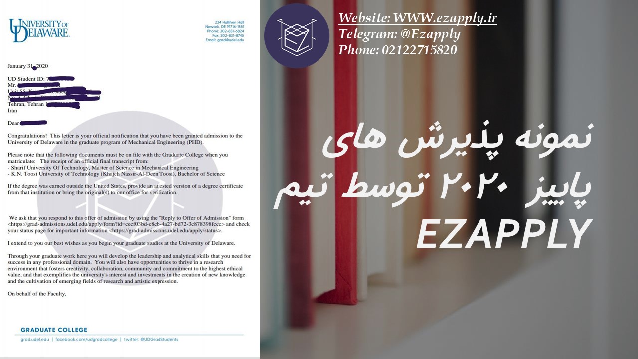 اخذ پذیرش مهندسی مکانیک در دانشگاه‌های «Delaware» آمریکا و «Carleton» کانادا در مقطع دکترا