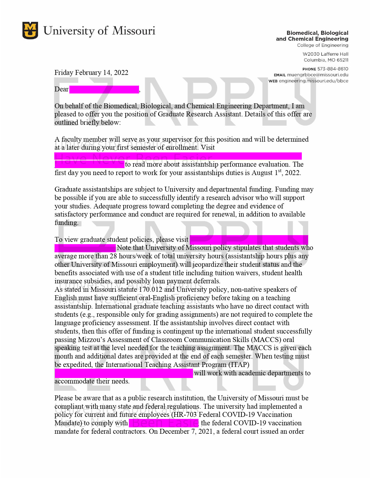 اخذ پذیرش توسط تیم «ایزی اپلای» در مقطع کارشناسی ارشد «شیمی» از دانشگاه «University of Missouri» آمریکا برای ترم پاییز 2022