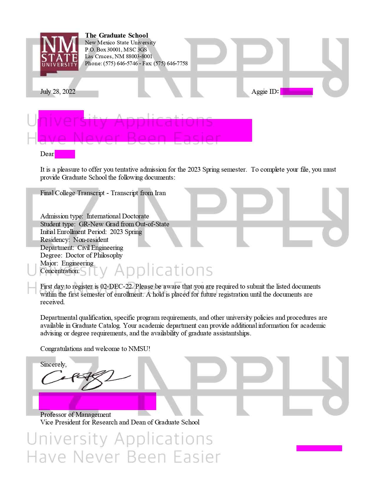 اخذ پذیرش فول فاند توسط تیم «ایزی اپلای» در مقطع دکتری در رشته «مهندسی عمران» از «New Mexico State University» در آمریکا برای ترم بهار 2023