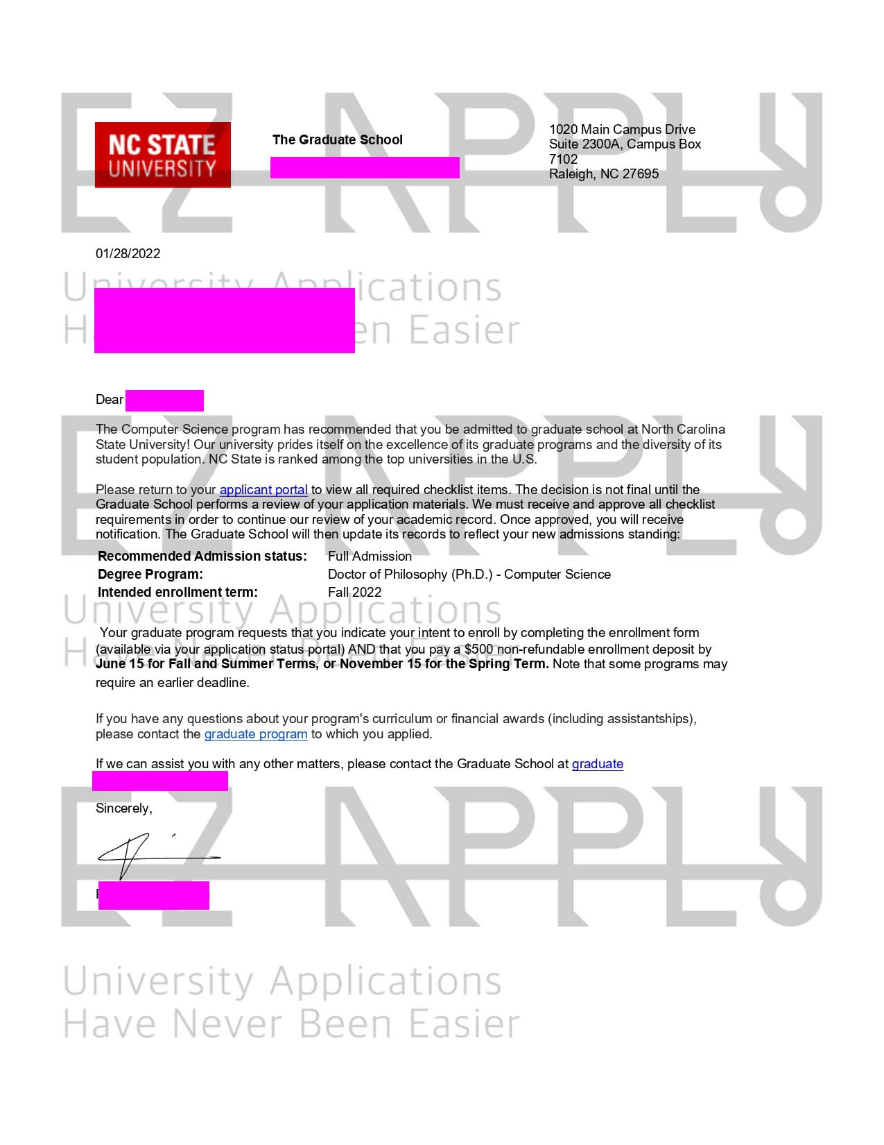 اخذ پذیرش توسط تیم «ایزی اپلای» در مقطع دکتری در رشته «علوم کامپیوتر » از دانشگاه ایالتی کارولینای شمالی آمریکا برای پاییز 2022