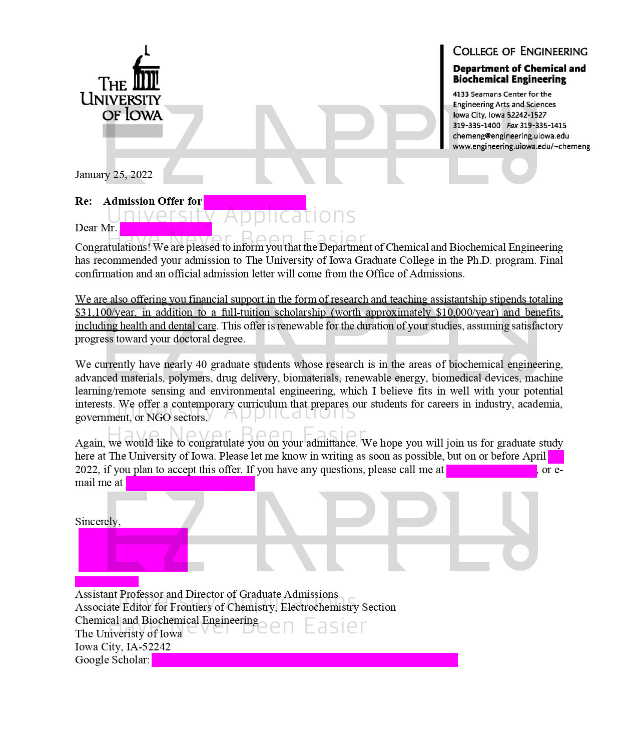 اخذ پذیرش فول فاند توسط تیم «ایزی اپلای» در مقطع دکتری «بیوشیمی» از دانشگاه «University of Iowa » در آمریکا برای ترم پاییز ۲۰۲۲