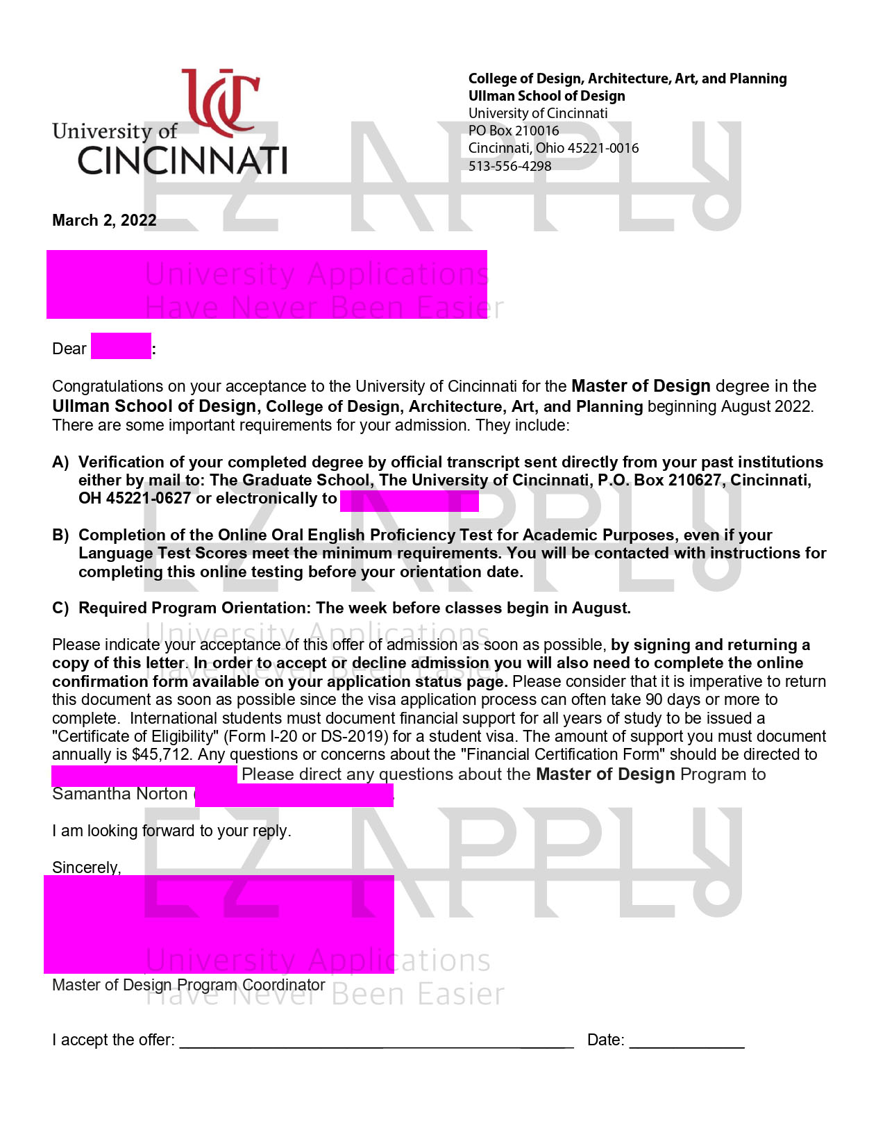 اخذ پذیرش توسط تیم «ایزی اپلای» در مقطع کارشناسی ارشد «طراحی» از دانشگاه «University of Cincinnati» آمریکا برای ترم پاییز 2022