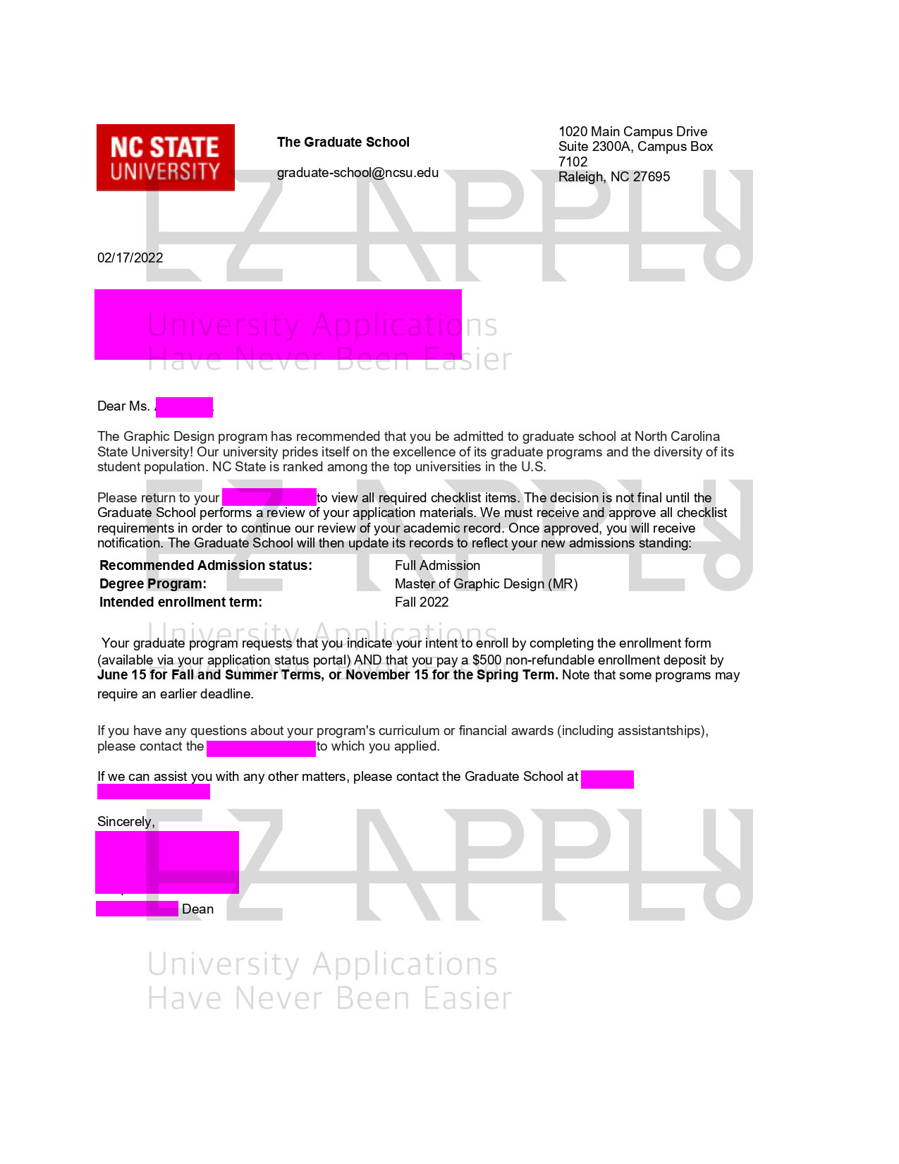اخذ پذیرش توسط تیم «ایزی اپلای» در مقطع کارشناسی ارشد «گرافیک» از دانشگاه «North Carolina State University» آمریکا برای ترم پاییز 2022