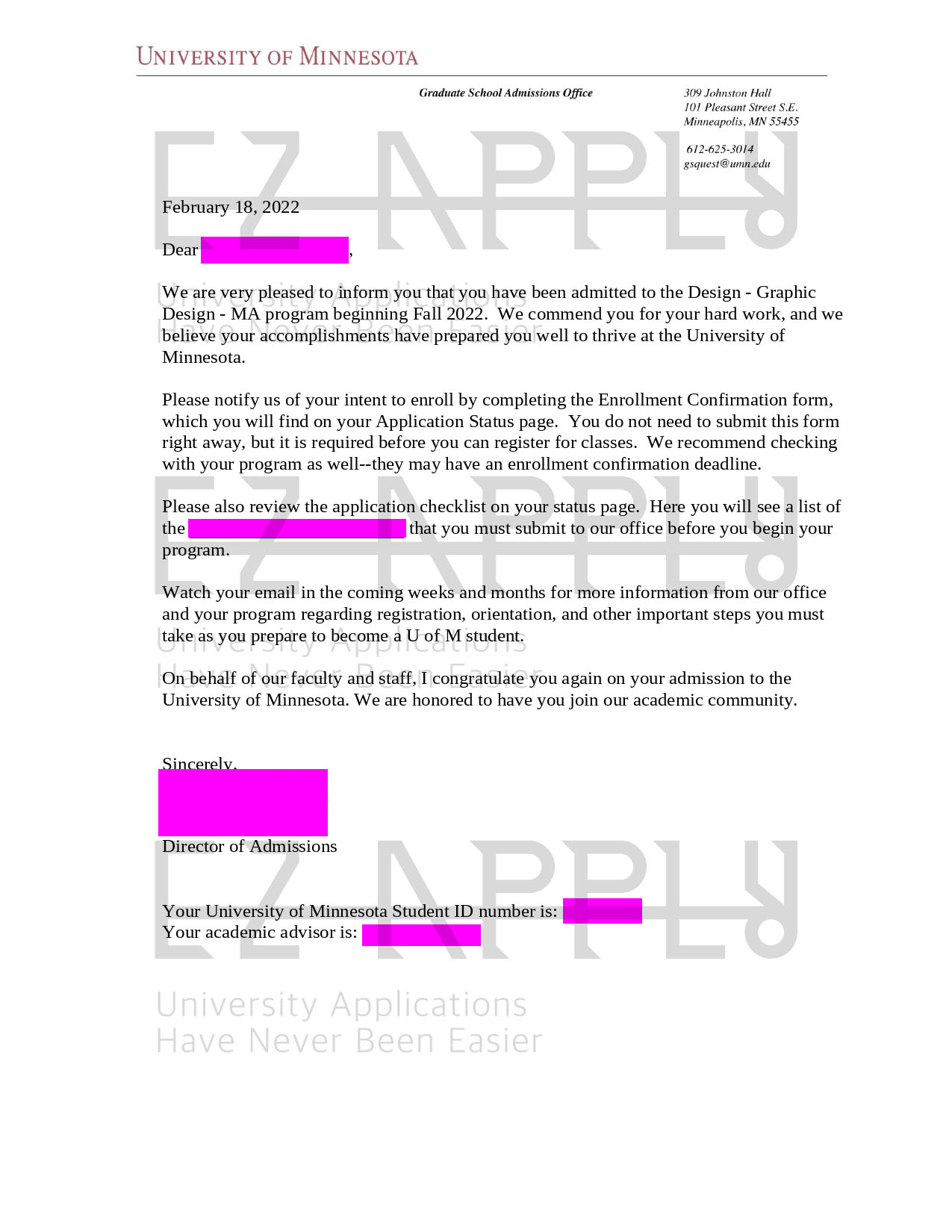 اخذ پذیرش توسط تیم «ایزی اپلای» در مقطع کارشناسی ارشد «گرافیک» از دانشگاه «University of Minnesota» آمریکا برای ترم پاییز 2022