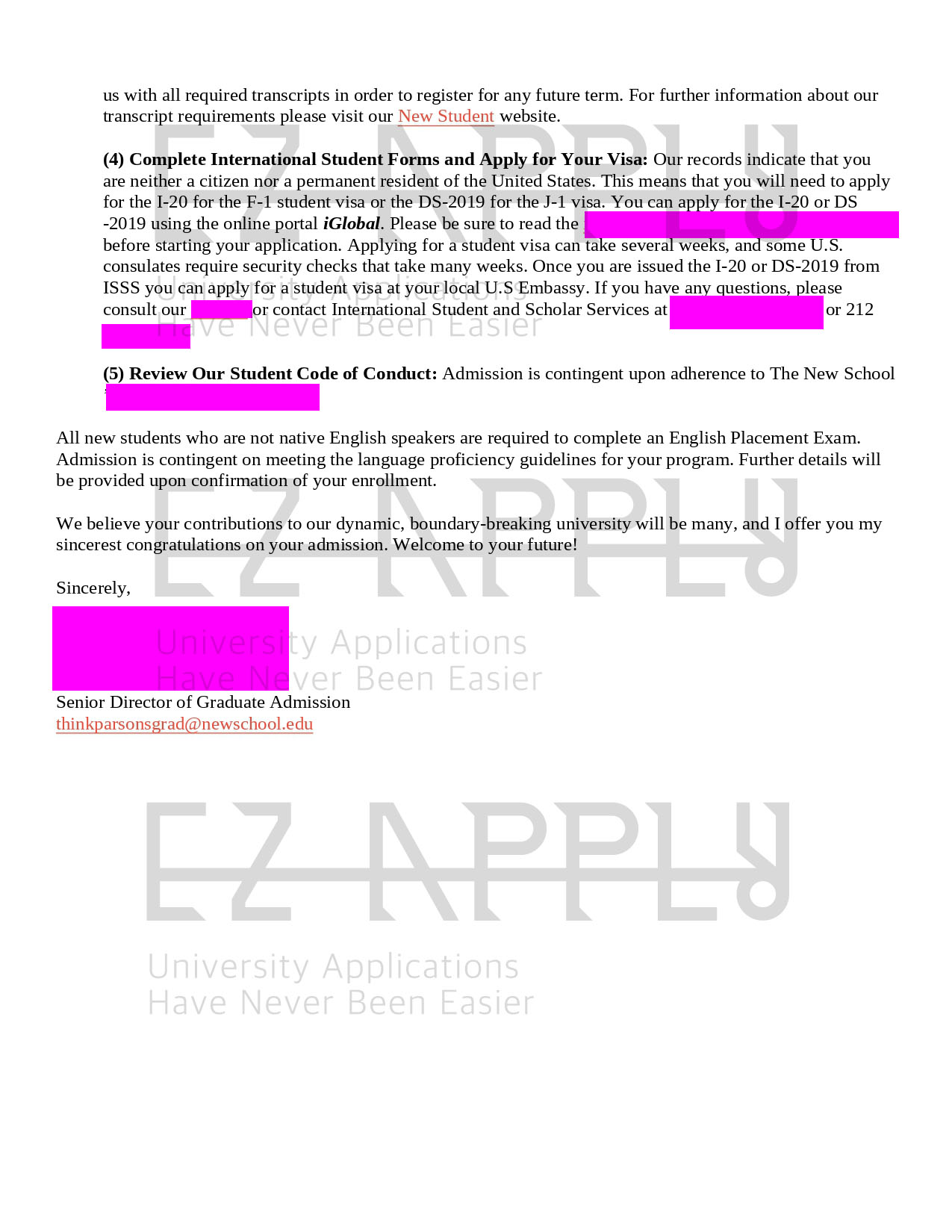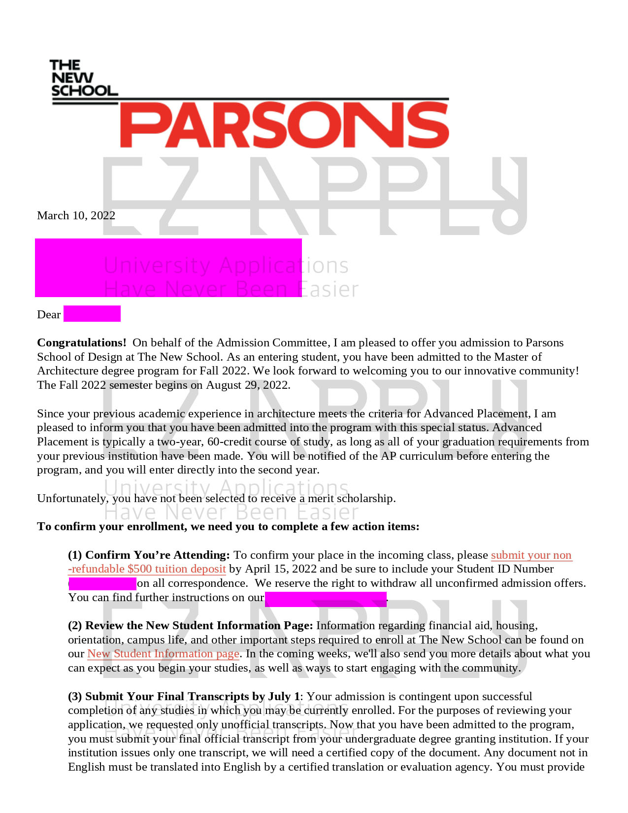 اخذ پذیرش توسط تیم «ایزی اپلای» در مقطع کارشناسی ارشد «معماری» از دانشگاه «Parsons School of Design» آمریکا برای ترم پاییز 2022