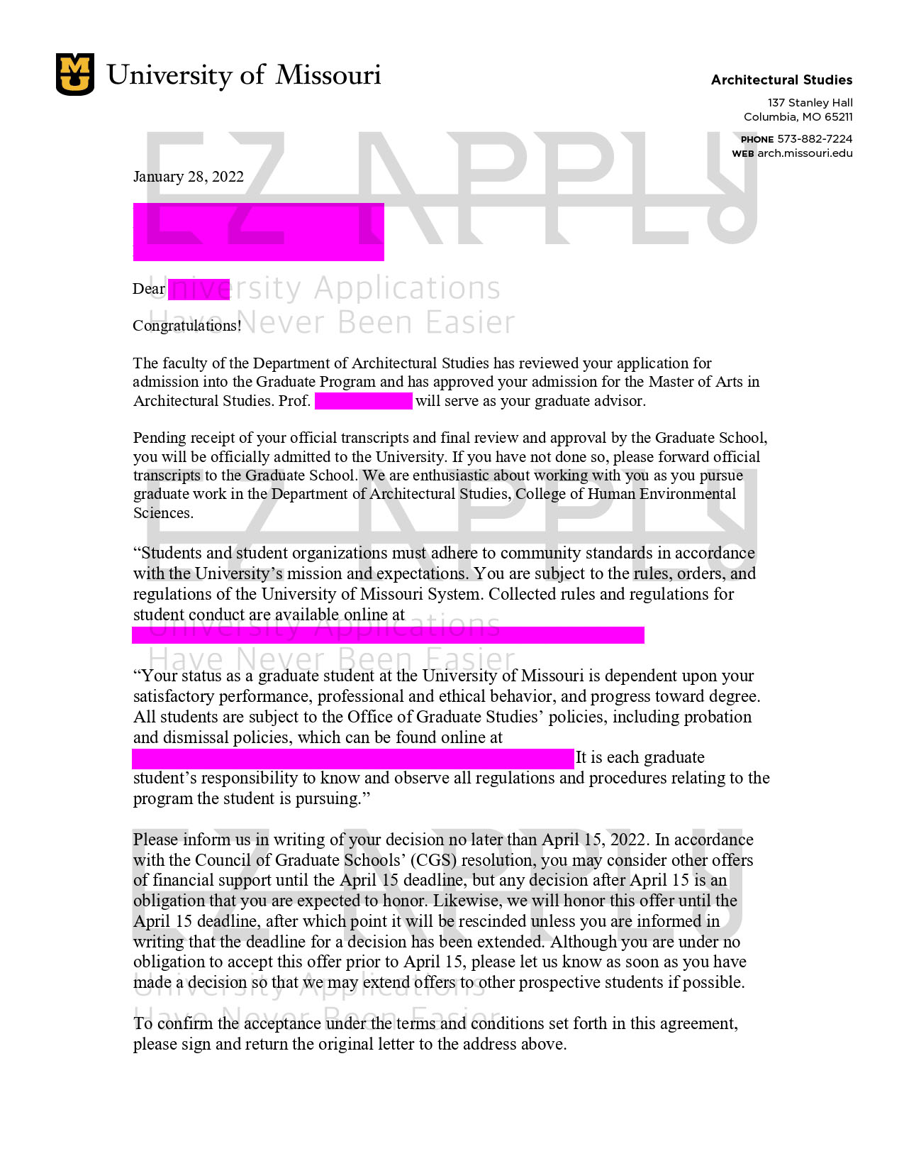 اخذ پذیرش فول فاند توسط تیم «ایزی اپلای» در مقطع کارشناسی ارشد «مطالعات معماری» از دانشگاه «University of Missouri» آمریکا برای ترم پاییز 2022