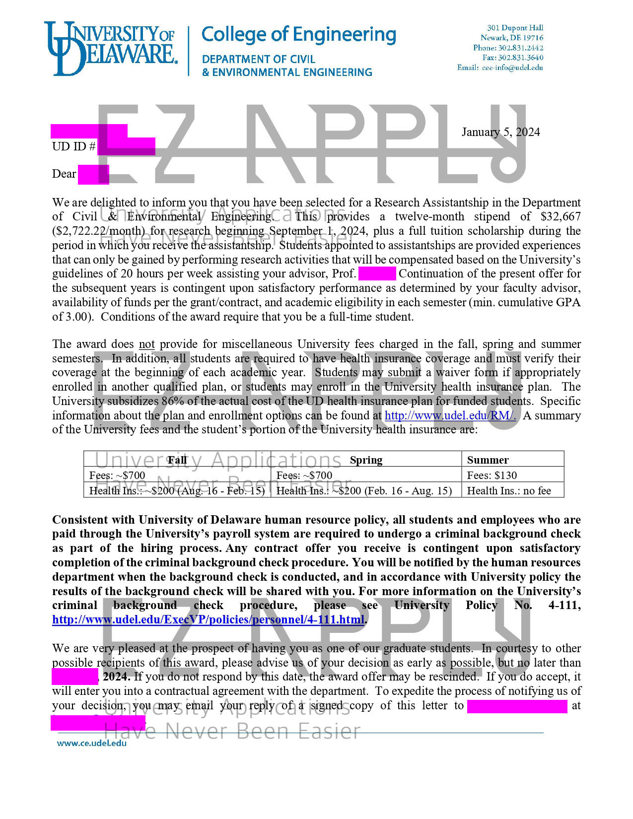 ادمیشن فول فاند اخذ شده در مقطع «دکتری» در رشته «Civil & Environmental Engineering» از University of Delaware درآمریکا برای پاییز 2024
