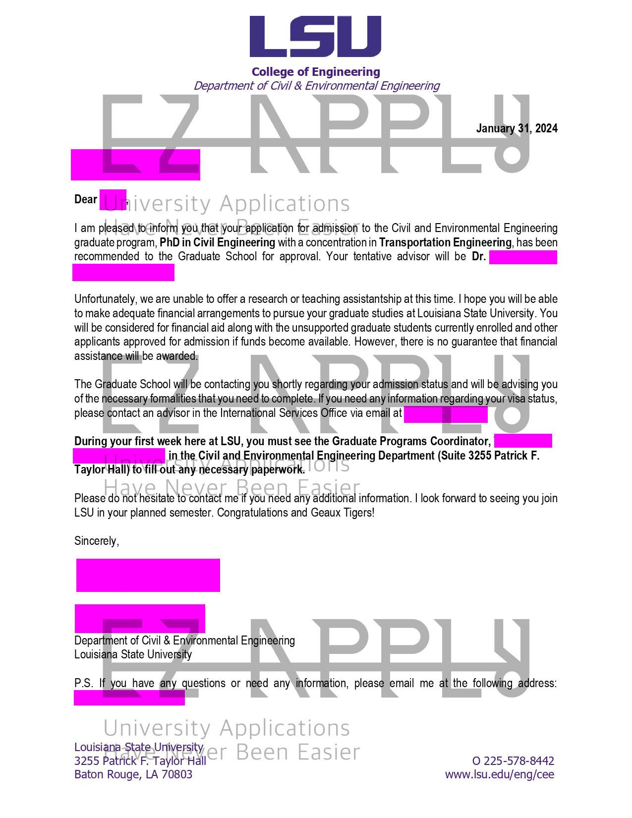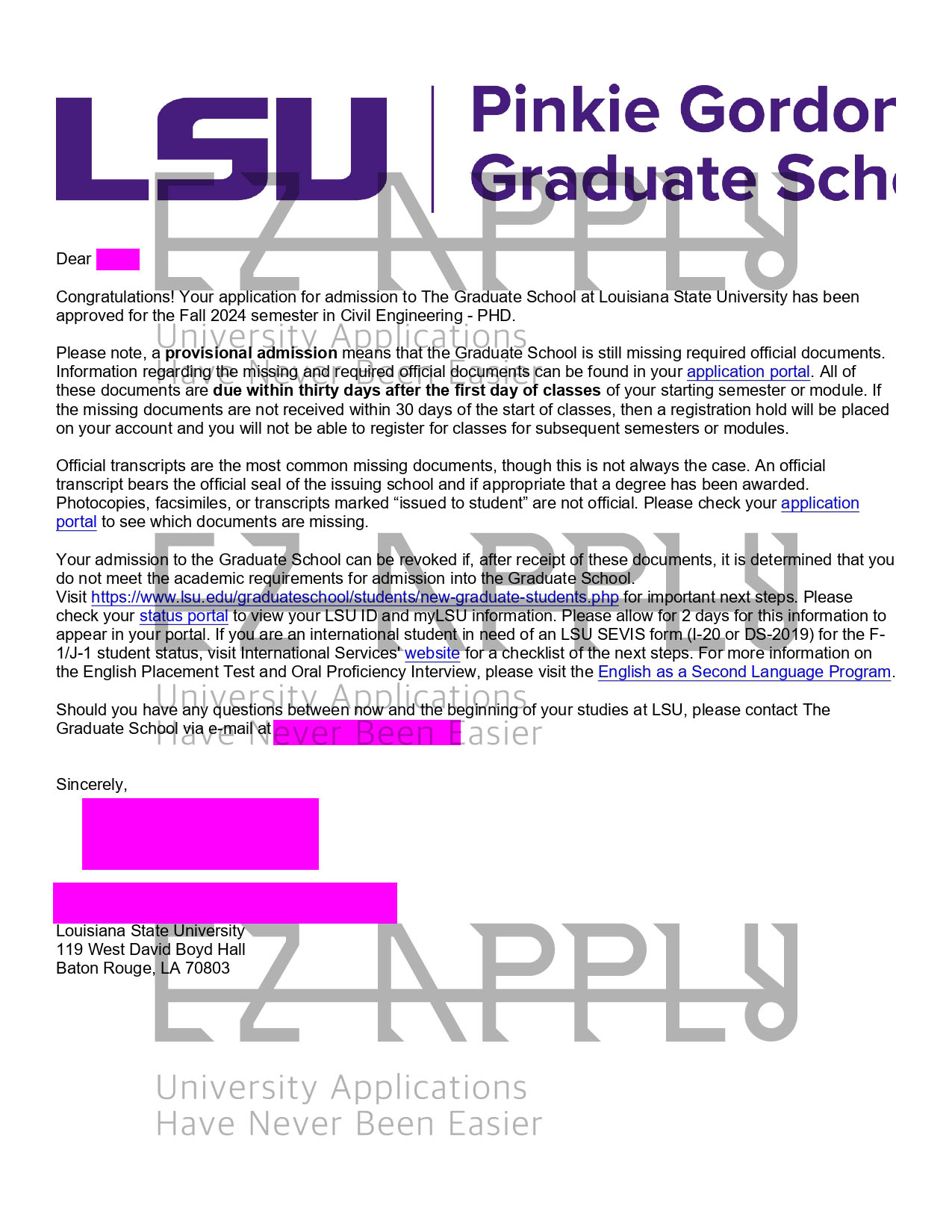 ادمیشن اخذ شده در مقطع «دکتری» در رشته «Civil Engineering» از Louisiana State University در آمریکا برای پاییز 2024