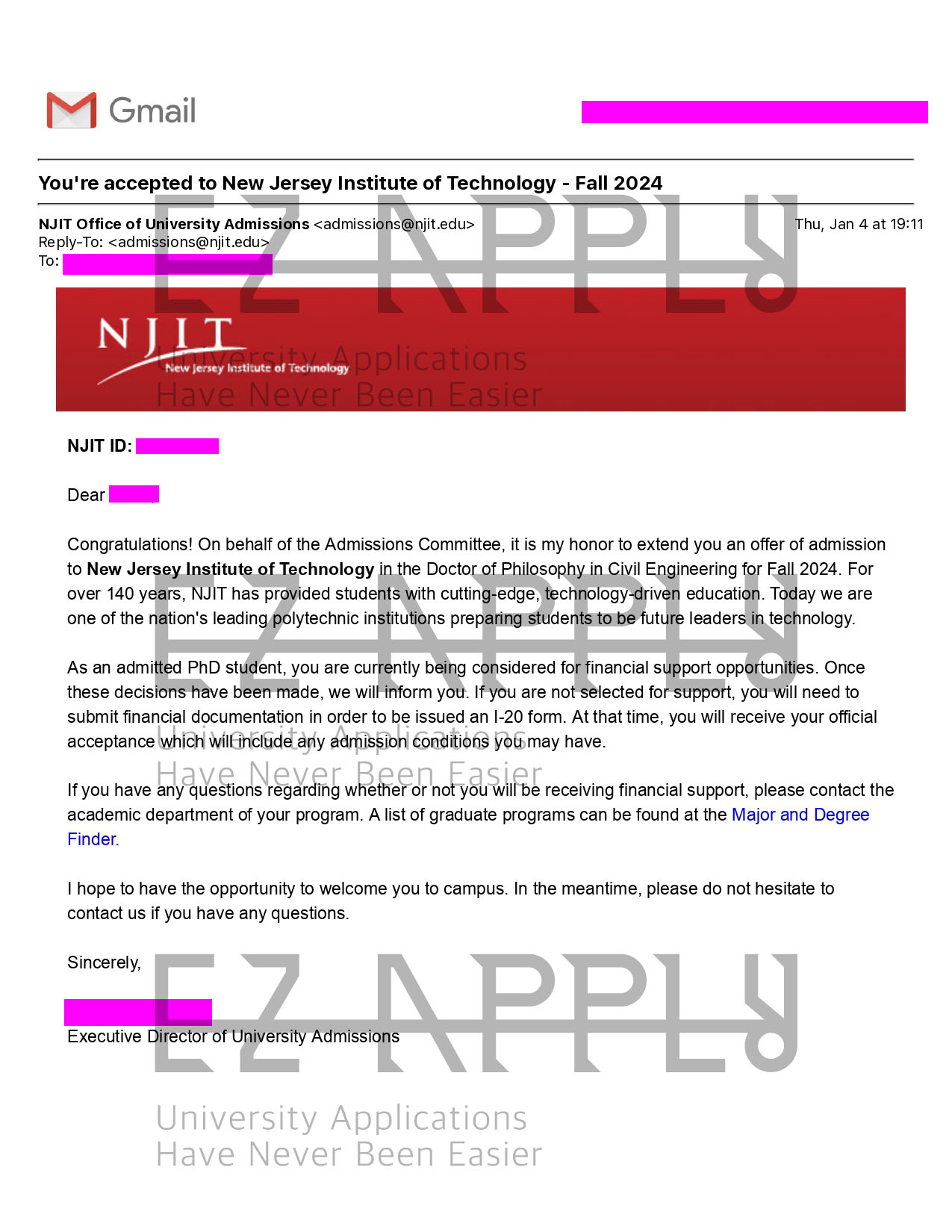 ادمیشن اخذ شده در مقطع «دکتری» در رشته «Civil Engineering» از New Jersey Institute of Technology در آمریکا برای پاییز 2024