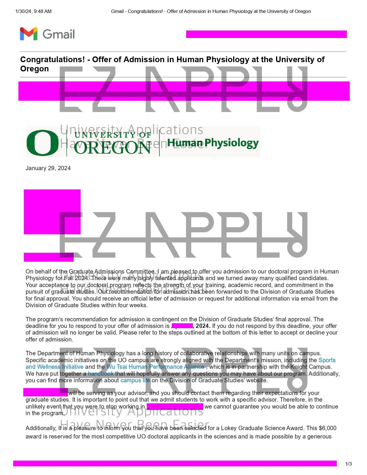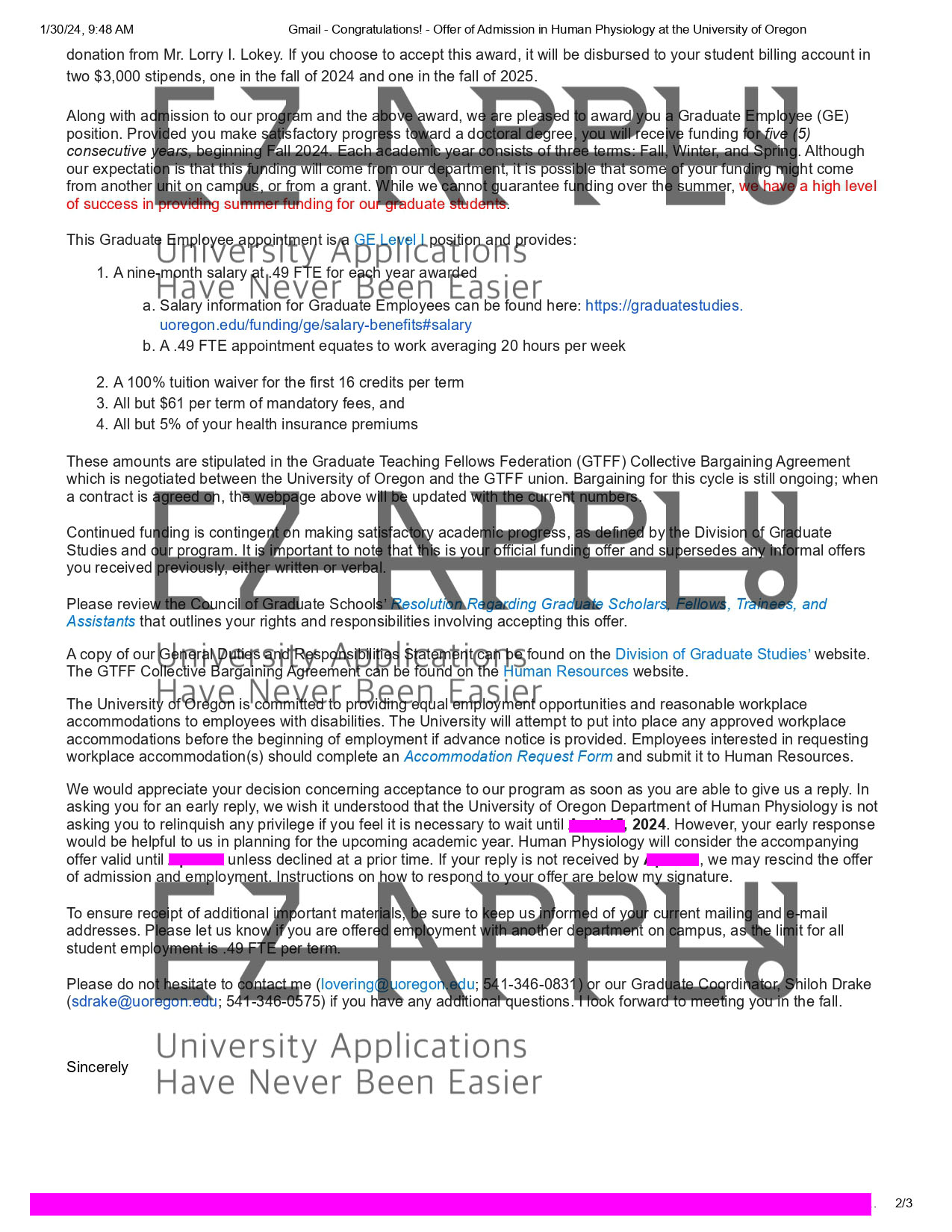 ادمیشن فول فاند اخذ شده در مقطع «دکتری» در رشته «Human physiology» از University of Oregon در آمریکا برای پاییز 2024