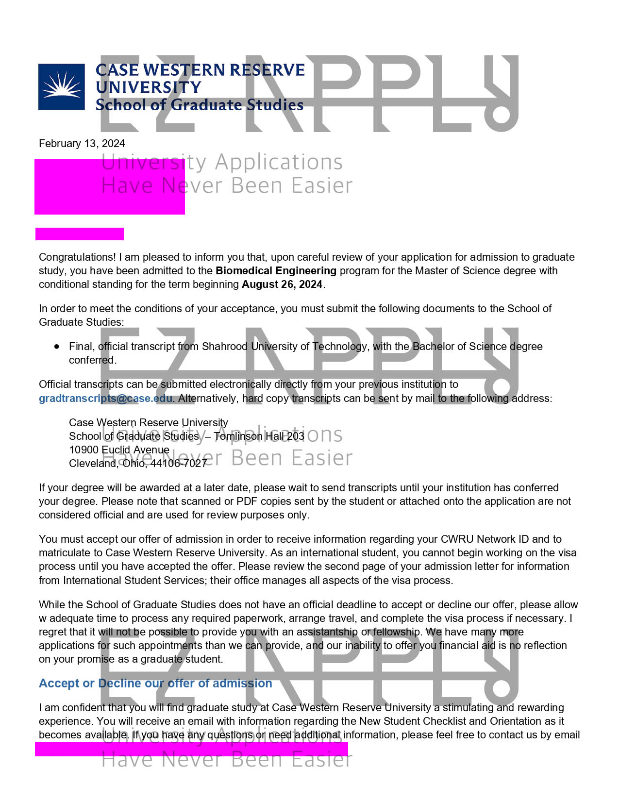 ادمیشن اخذ شده در مقطع «کارشناسی ارشد» در رشته «Biomedical Engineering» از Case Western Reserve University درآمریکا برای پاییز 2024