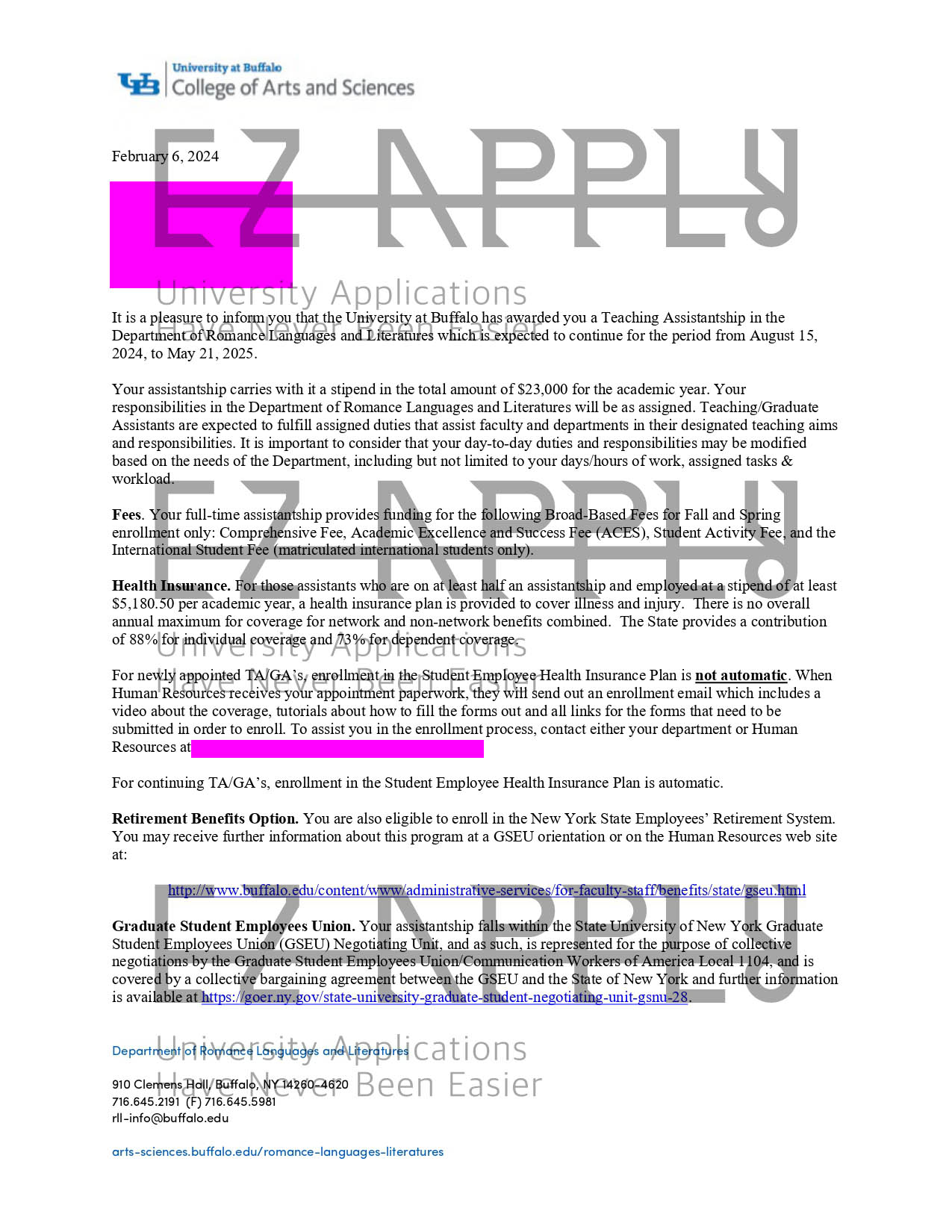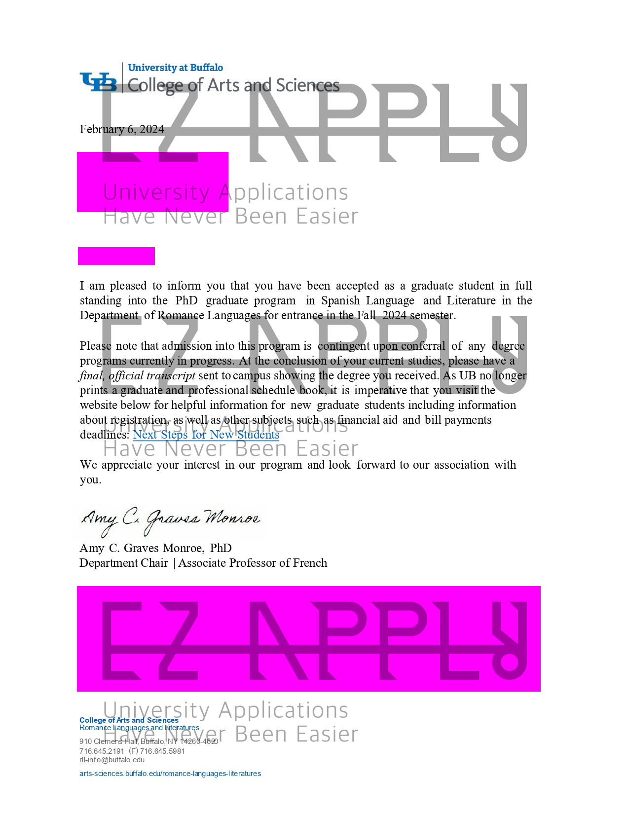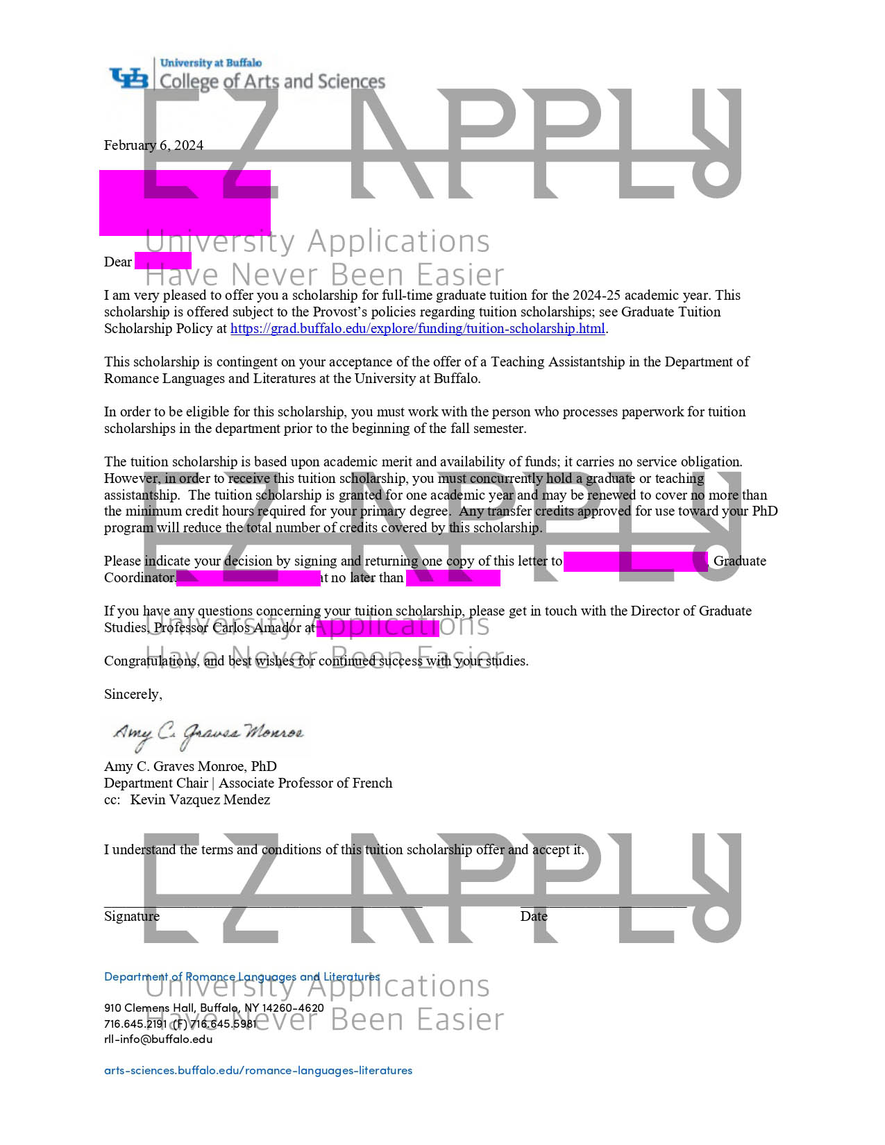 ادمیشن فول فاند اخذ شده در مقطع «دکتری» در رشته «Spanish Language and Literature» از University at Buffalo در آمریکا برای پاییز 2024