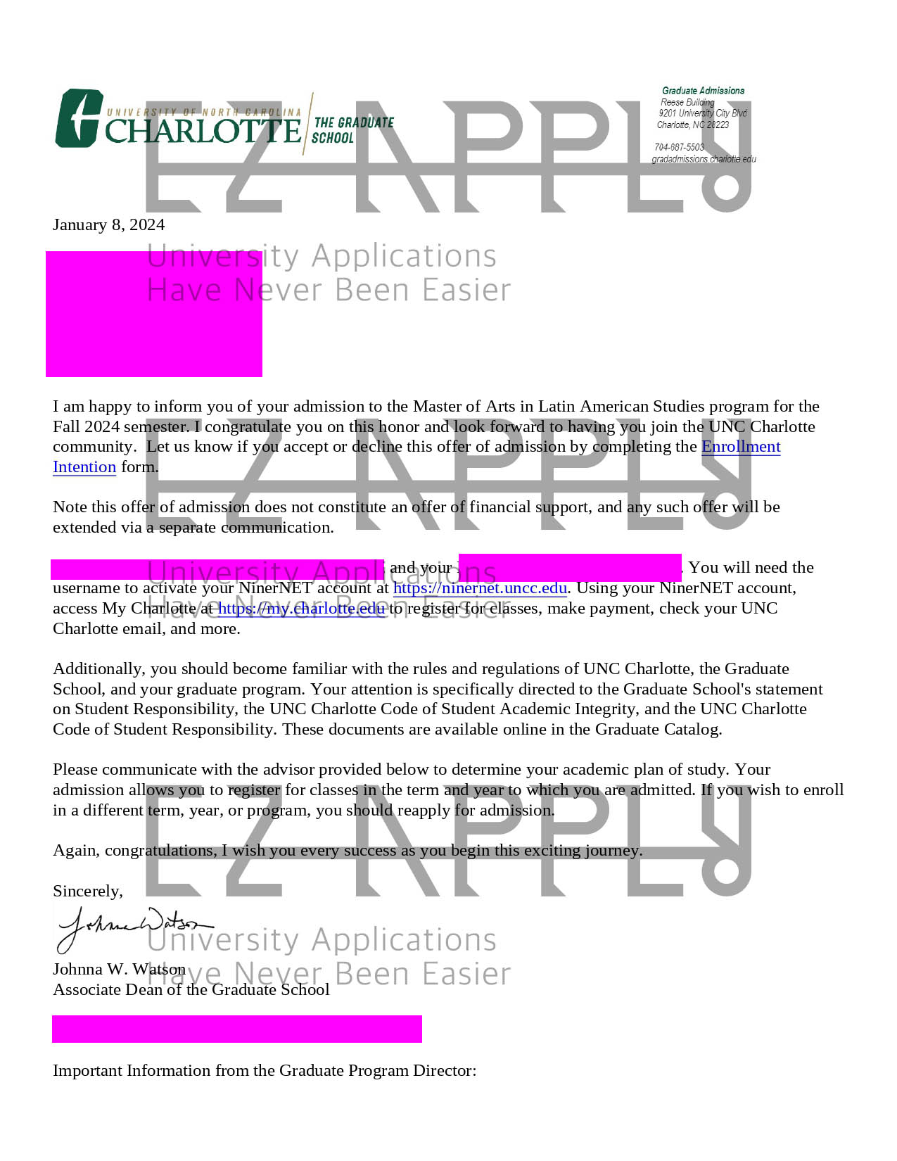 ادمیشن اخذ شده در مقطع «کارشناسی ارشد» در رشته «Latin American studies» از University of North Carolina Charlotte در آمریکا برای پاییز 2024