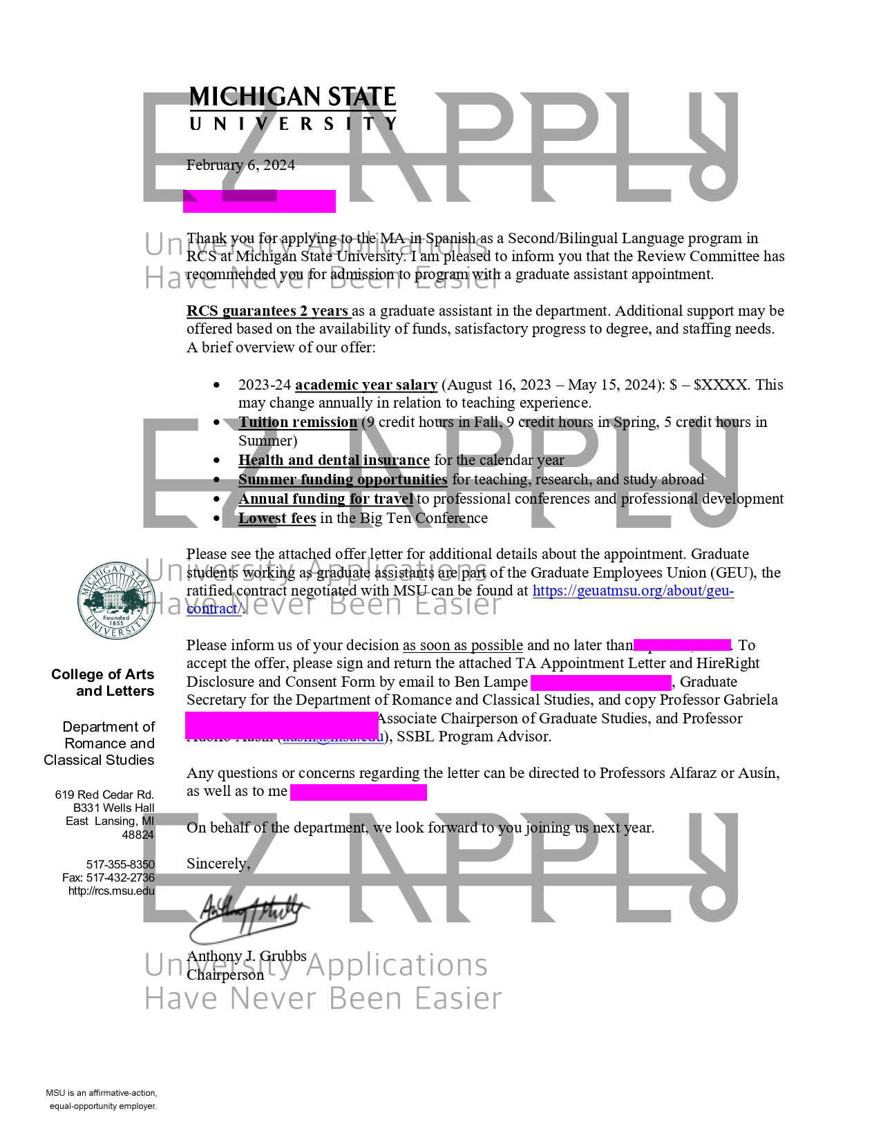 ادمیشن فول فاند اخذ شده در مقطع «کارشناسی ارشد» در رشته «Spanish as a Second/Bilingual Language» از Michigan State University در آمریکا برای پاییز 2024