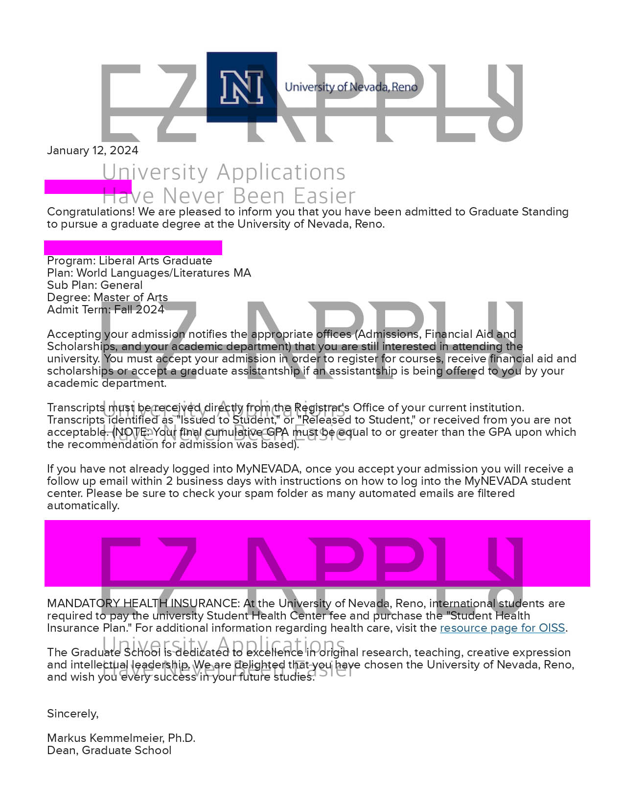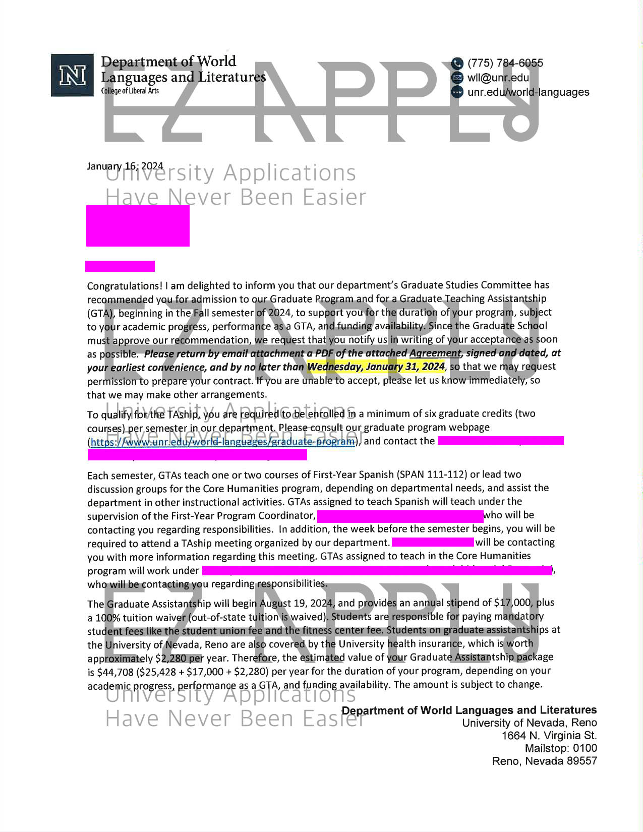 ادمیشن فول فاند اخذ شده در مقطع «کارشناسی ارشد» در رشته «World Languages/Literatures» از University of Nevada, Reno  در آمریکا برای پاییز 2024
