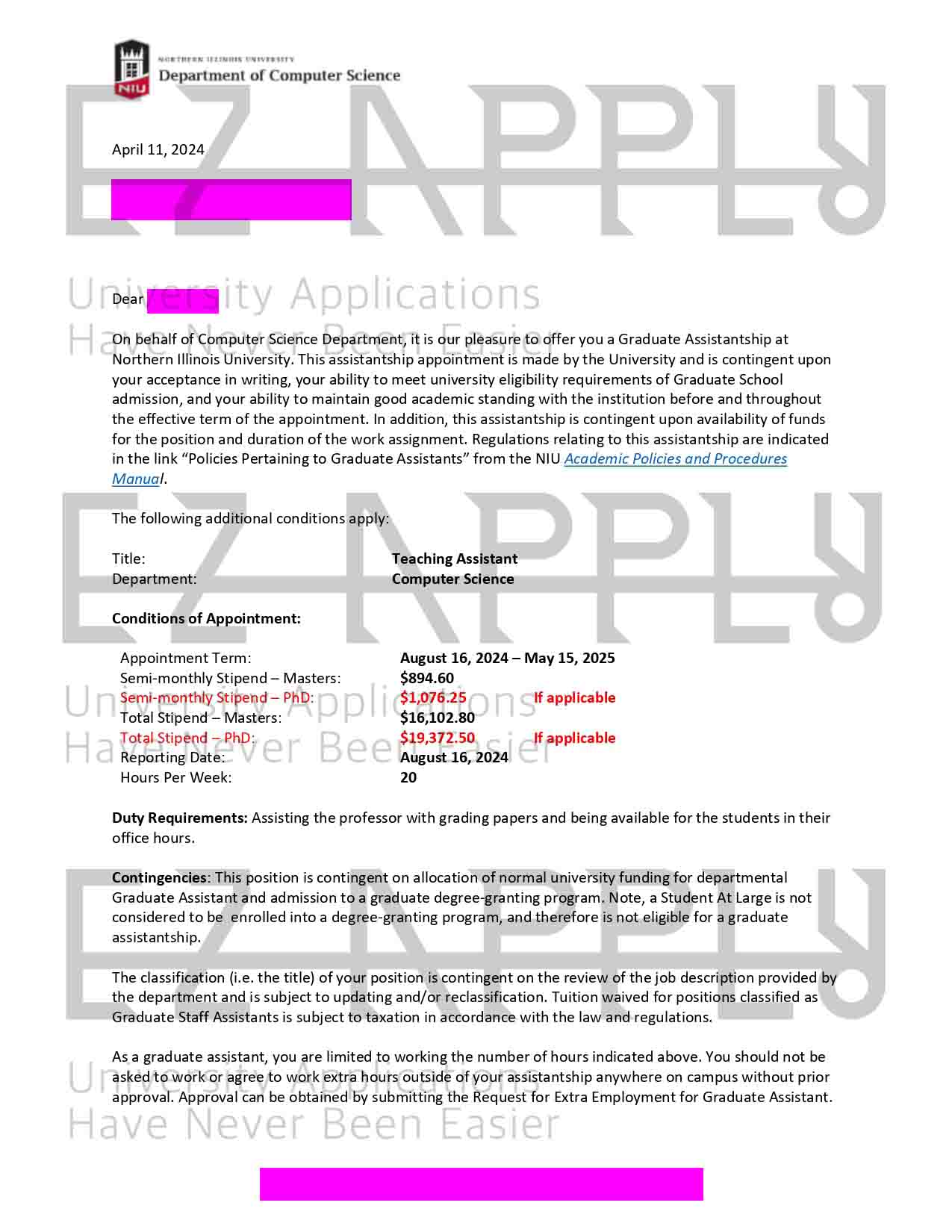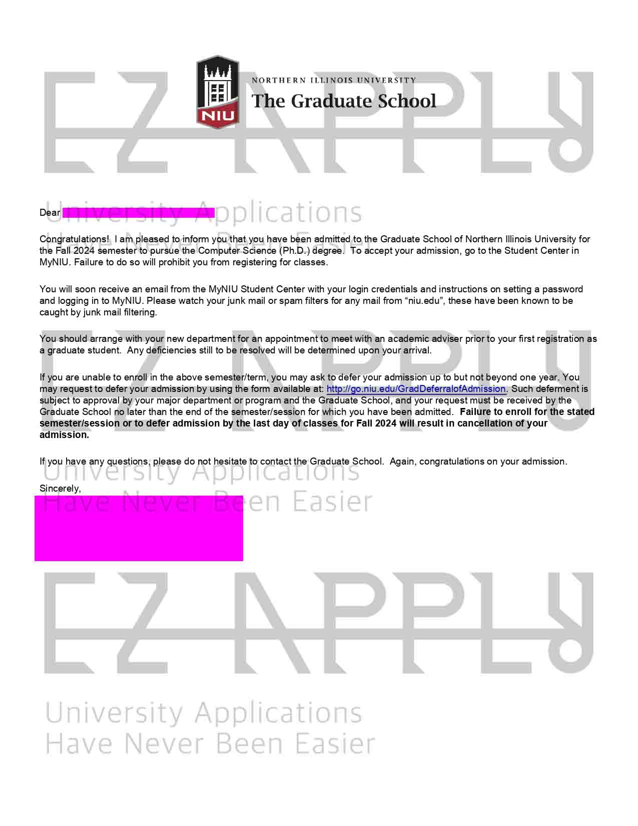 ادمیـشن فول فاند اخذ شده توسط تیم ایزی اپلای در مقطع «دکتری» در رشته « Computer Science» از Northern Illinois University برای پاییز 2024