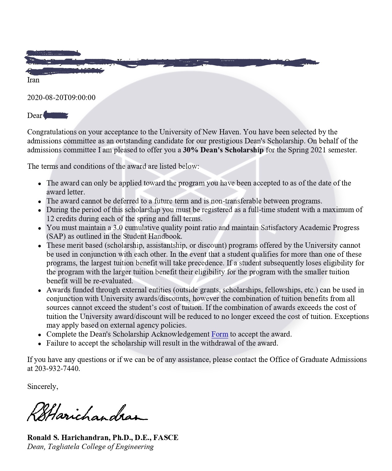 - .اخذ پذیرش توسط تیم «ایزی اپلای» در مقطع کارشناسی ارشد در رشته «مهندسی برق» از دانشگاه « New Haven» درآمریکا برای ترم ژانویه 2021