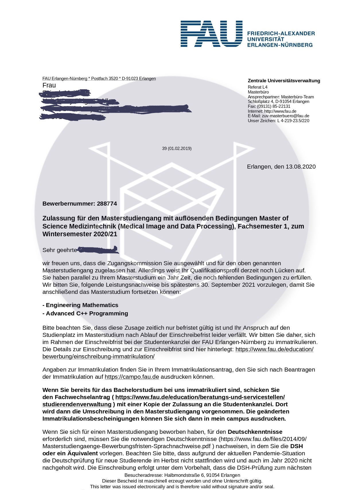 - .اخذ پذیرش توسط تیم «ایزی اپلای» در مقطع کارشناسی ارشد در رشته «پردازش داده ها و تصاویر پزشکی(شاخه ای از مهندسی پزشکی)» از دانشگاه « University of Erlangen-Nuremberg» درآلمان برای ترم اکتبر 2020