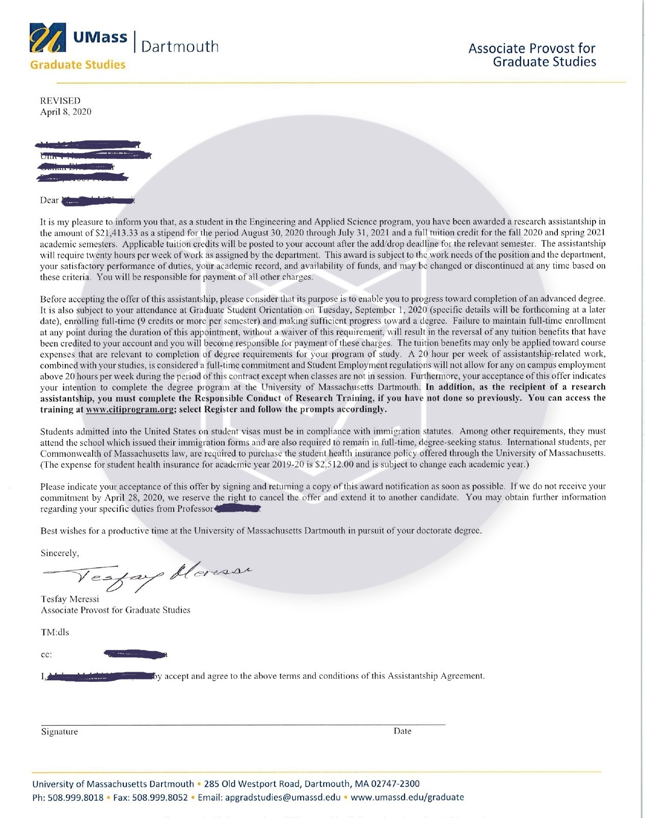 اخذ پذیرش توسط تیم «ایزی اپلای» در مقطع دکترا در رشته مهندسی و علوم کاربردی (برق و کامپیوتر) از دانشگاه «Massachusetts Dartmouth» کشور آمریکا برای ترم پاییز 2020