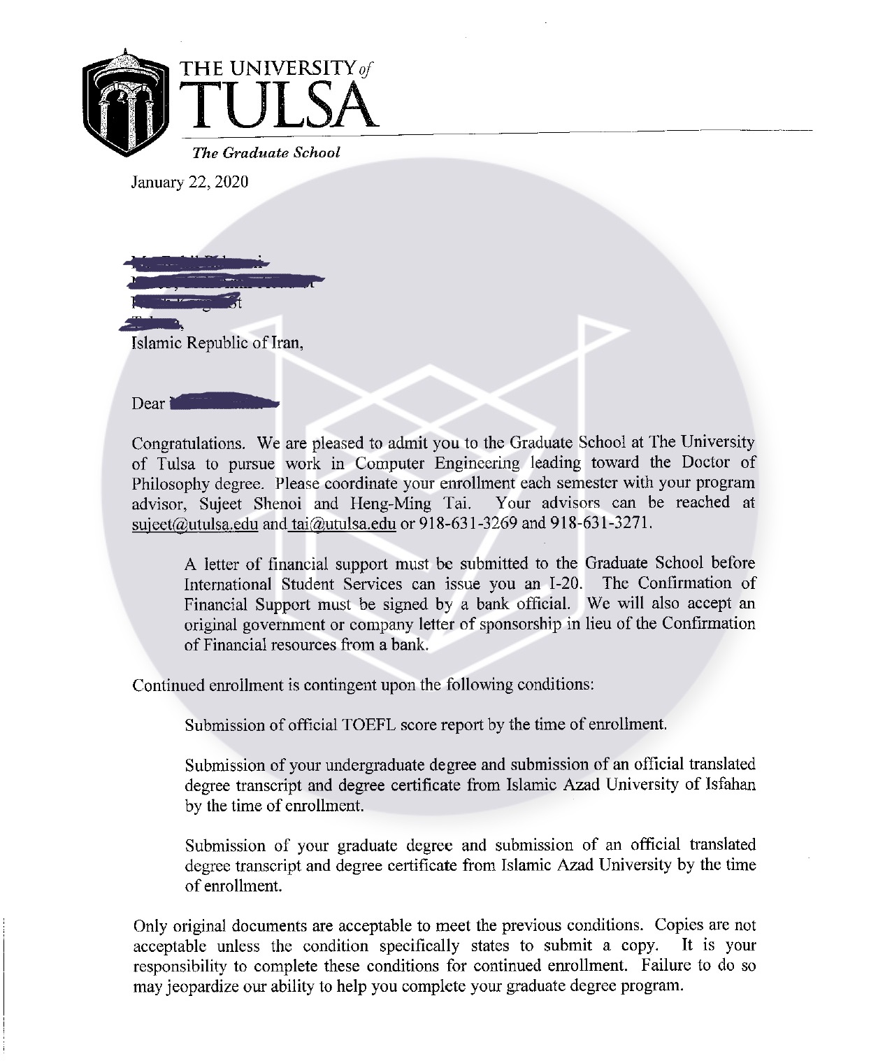 - اخذ پذیرش توسط تیم «ایزی اپلای» در مقطع دکترا در رشته «مهندسی برق و کامپیوتر» از دانشگاه « Tulsa» در ایالت اوکلاهاما آمریکا برای ترم پاییز 2020