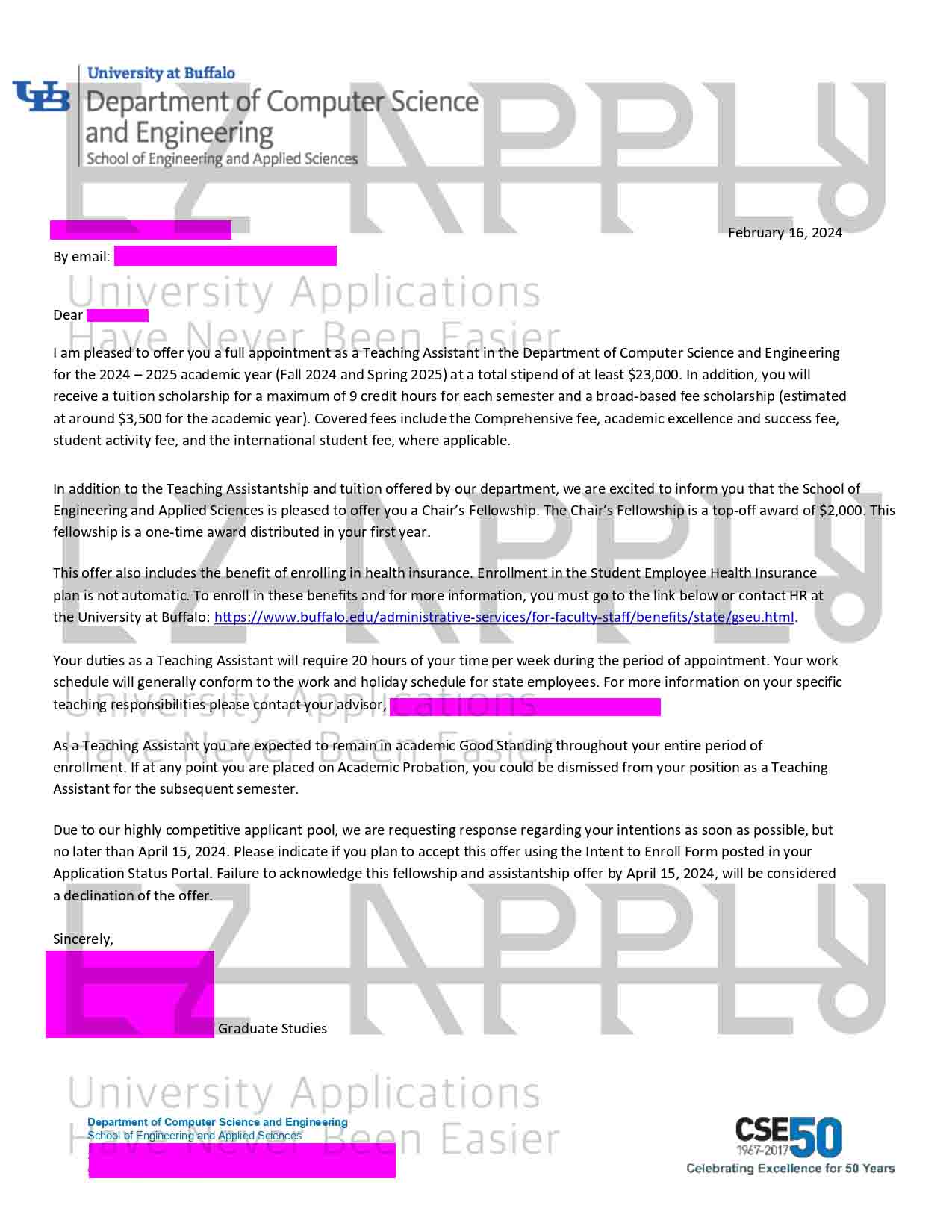 ادمیشن فول فاند اخذ شده توسط تیم ایزی اپلای در مقطع «دکترا» در رشته‌ی «Computer Science and Engineering» از University at Buffalo در آمریکا