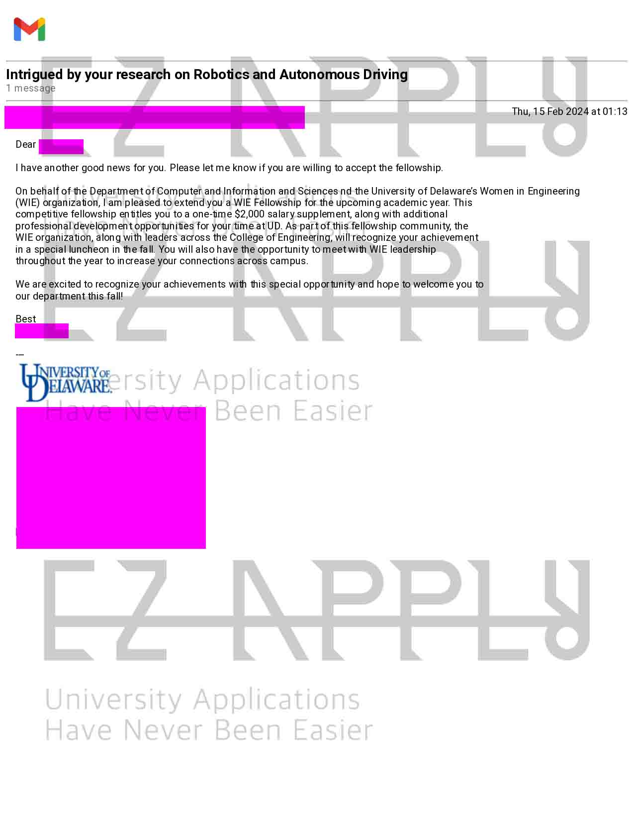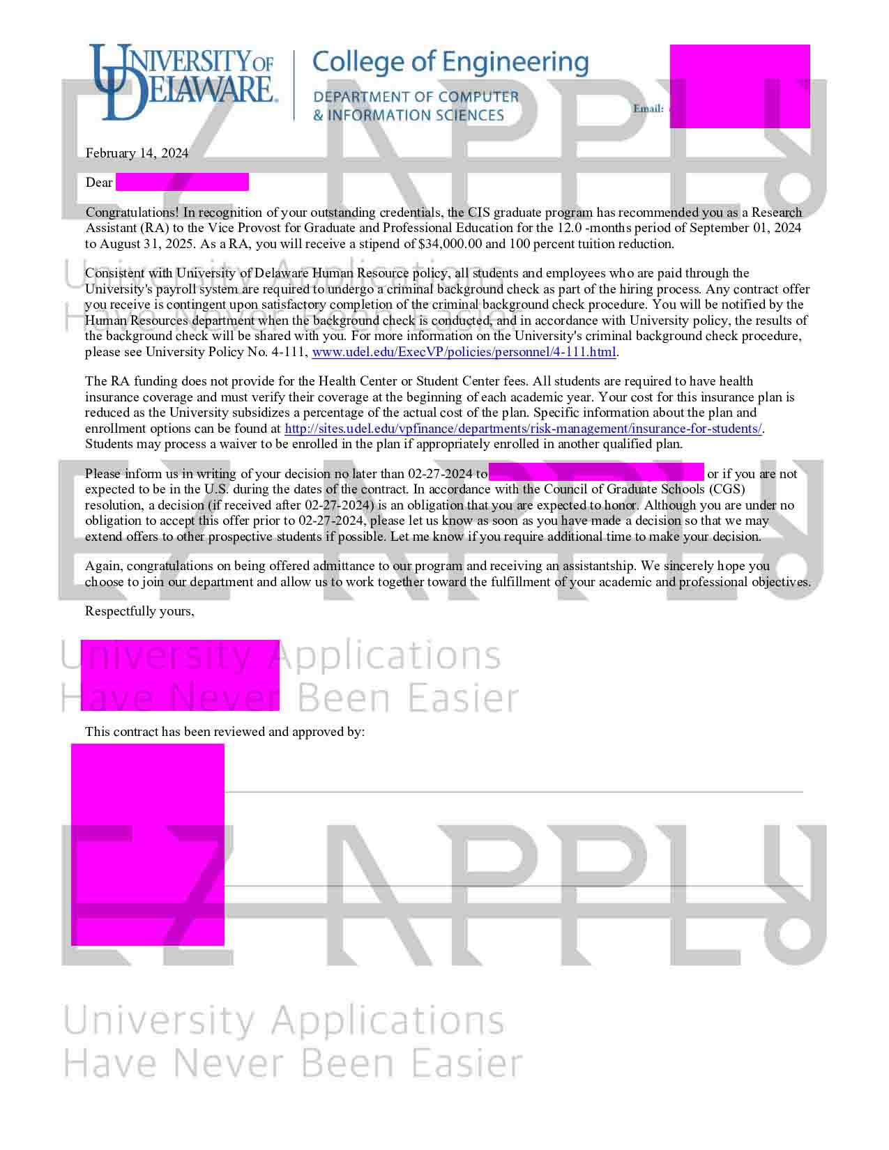 ادمیشن فول فاند اخذ شده توسط تیم ایزی اپلای در مقطع «دکترا» در رشته «Computer and Information Sciences» از University of Delaware در آمریکا برای پاییز 2024