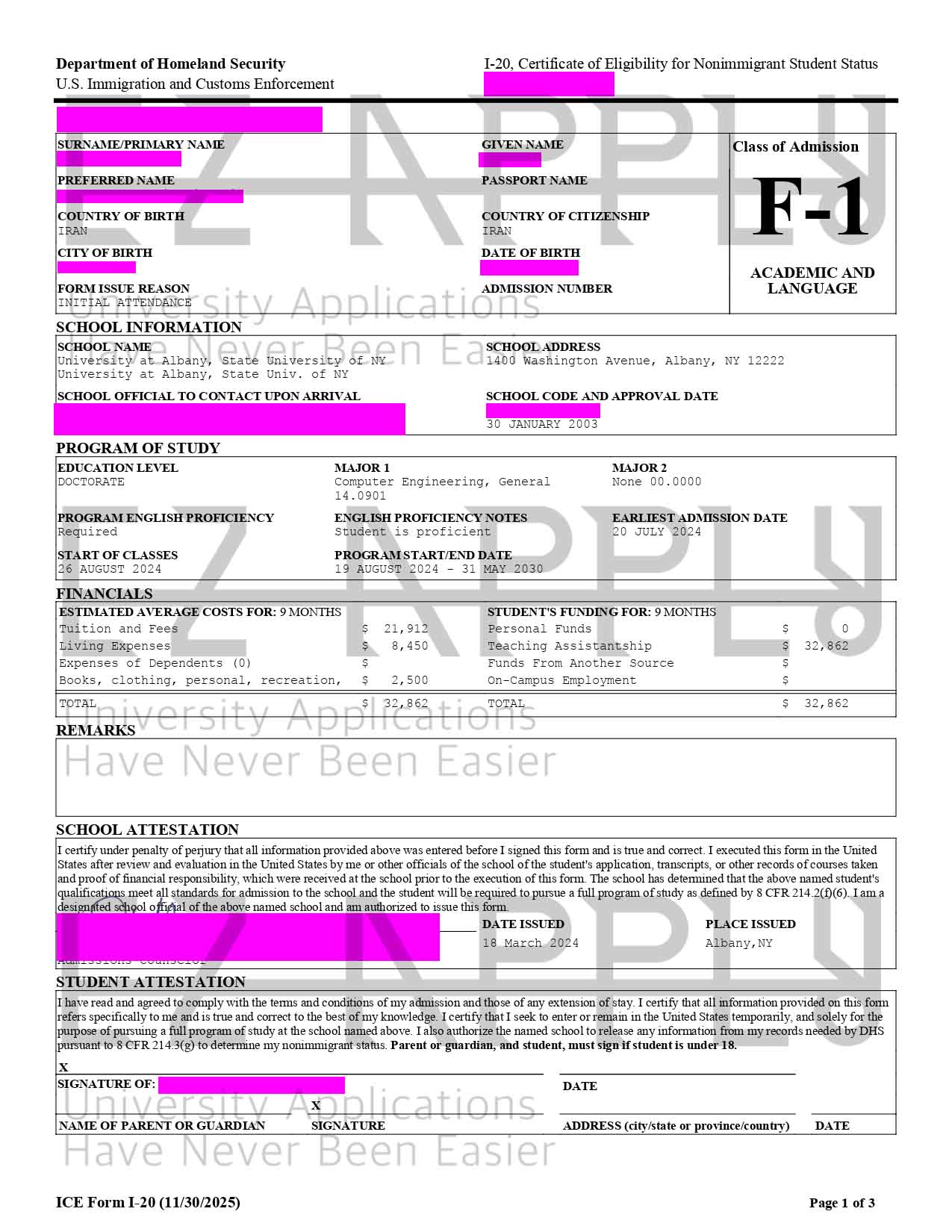ادمیشن فول فاند اخذ شده توسط تیم ایزی اپلای در مقطع «دکتری» در رشته «Computer Engineering» از University of Albany در آمریکا برای پاییز 2024