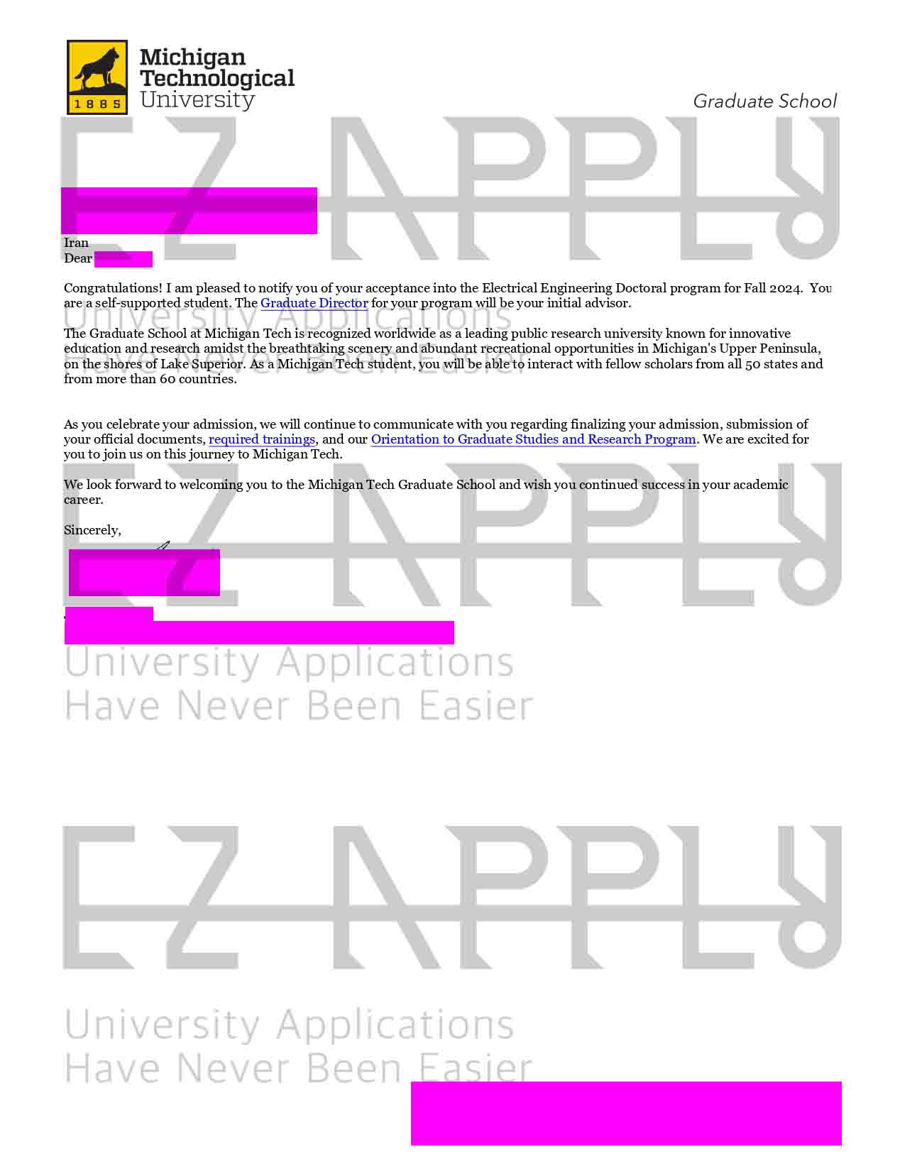 ادمیشن اخذ شده توسط تیم ایزی اپلای در مقطع «دکتری» در رشته «Electrical Engineering» از Michigan Technological University در آمریکا برای پاییز 2024