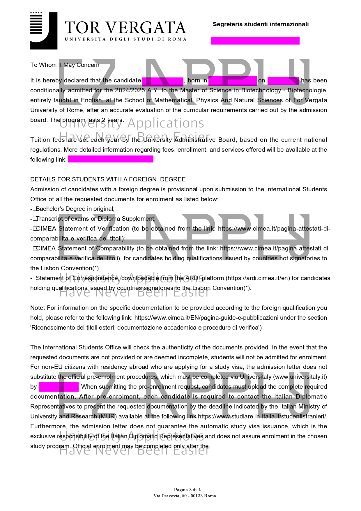 اخذ ادمیــشن توسط تیم ایزی اپلای در مقطع «کارشناس ارشد» در رشته «Biotechnology» از Università degli Studi di Roma Tor Vergata در ایتالیا برای پاییز 2024
