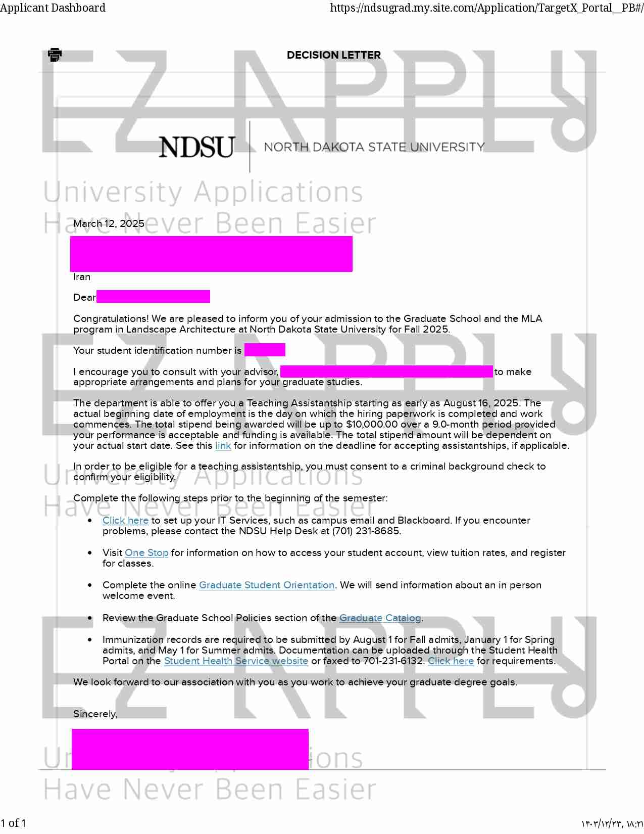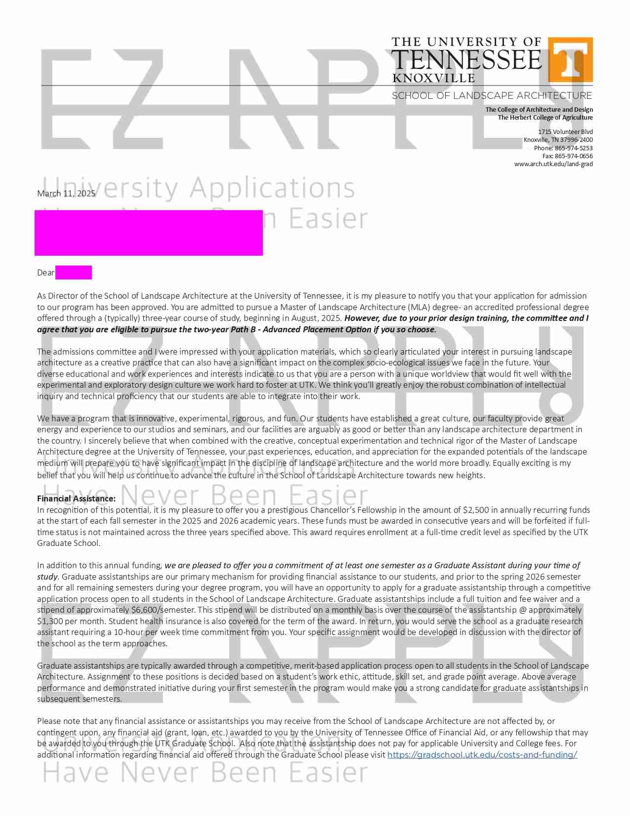 اخذ ادمیــشن فول فاند توسط تیم ایزی اپلای در مقطع «کارشناسی ارشد» در رشتهی «Landscape Architecture» از University of Tennessee در آمریکا برای پاییز ۲۰۲۵