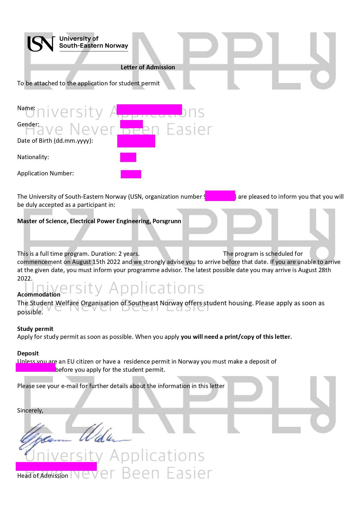 اخذ پذیرش توسط تیم «ایزی اپلای» در مقطع کارشناسی ارشد در رشته «مهندسی برق قدرت» از «University of South-Eastern Norway» در نروژ برای پاییز 2022
