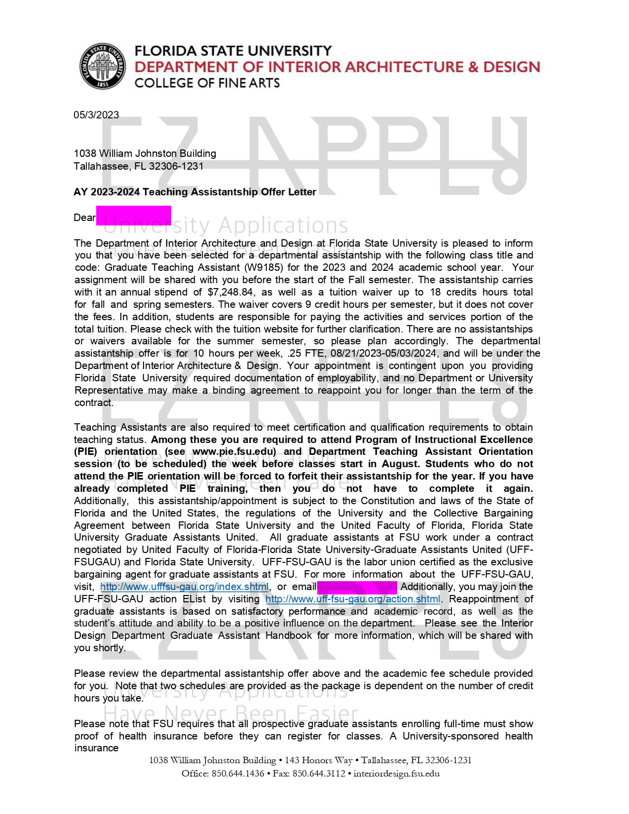 اخذ پذیرش با فاند توسط تیم «ایزی اپلای» در مقطع «کارشناسی ارشد» در رشته ی «طراحی داخلی» از دانشگاه «Florida State University » در آمریکا برای ترم پاییز 2023