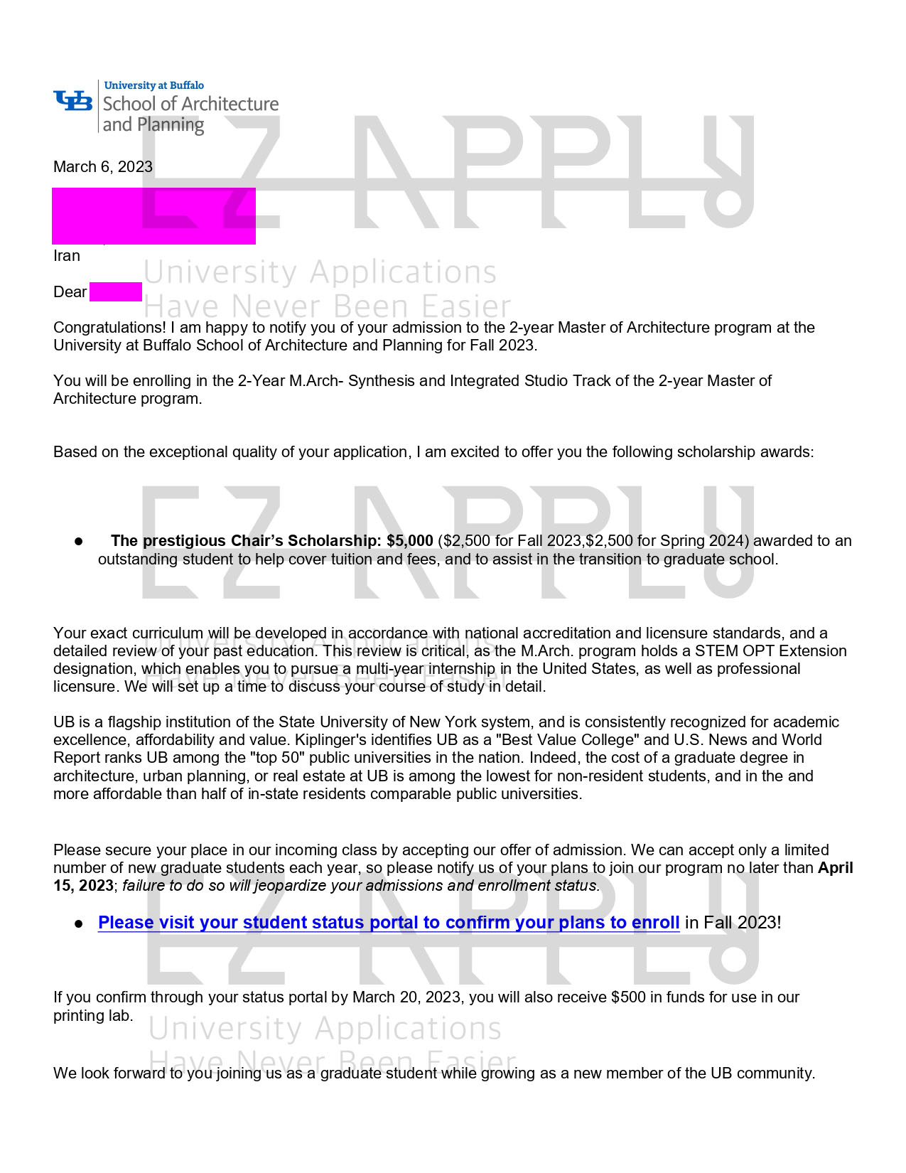 اخذ پذیرش با اسکالرشیپ توسط تیم «ایزی اپلای» در مقطع «کارشناسی ارشد» در رشته ی «مهندسی معماری» از دانشگاه «University at Buffalo» در آمریکا برای ترم پاییز 2023