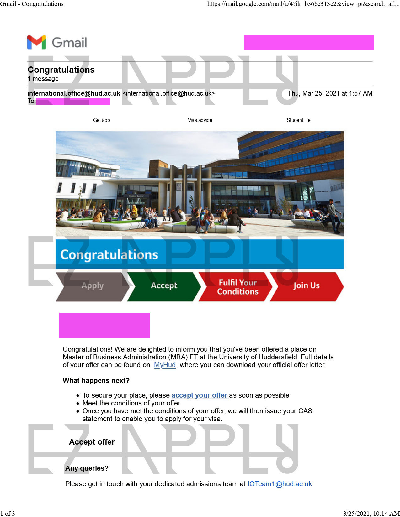 - اخذ پذیرش توسط تیم «ایزی اپلای» در مقطع کارشناسی ارشد در رشته «مدیریت کسب و کار» از دانشگاه «Huddersfield» در انگلیس برای ترم پاییز 2021