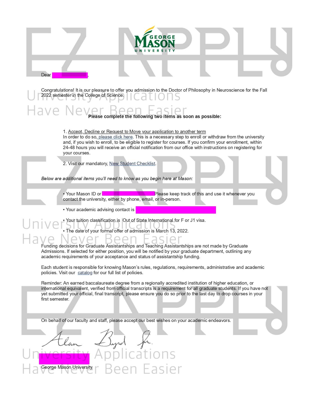اخذ پذیرش توسط تیم «ایزی اپلای» در مقطع دکتری در رشته «Neuroscience» از «George Mason University» در آمریکا برای پاییز 2022