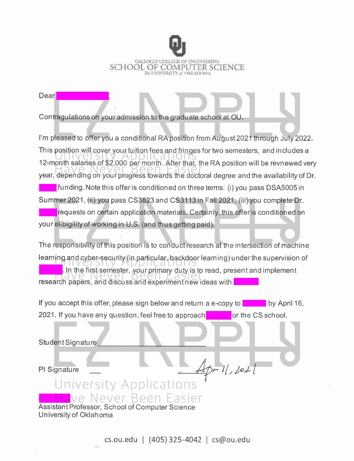 - اخذ پذیرش فول فاند توسط تیم «ایزی اپلای» در مقطع دکتری در رشته «علوم کامپیوتر» از «Oklahoma» در آمریکا برای ترم پاییز 2021