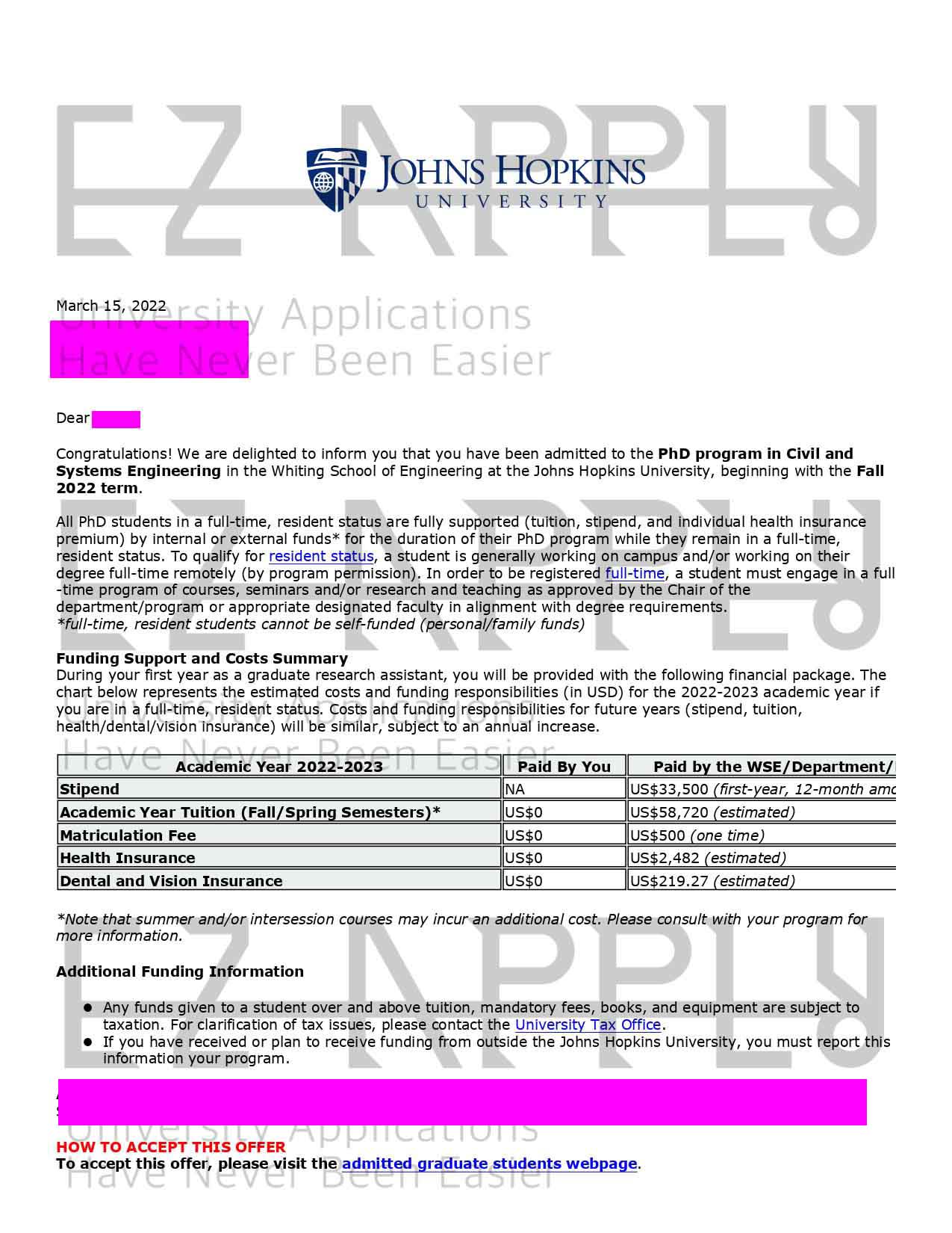 اخذ پذیرش فول فاند توسط تیم «ایزی اپلای» در مقطع دکتری در رشته «مهندسی عمران و سیستم» از «Johns Hopkins University» در آمریکا برای پاییز 2022