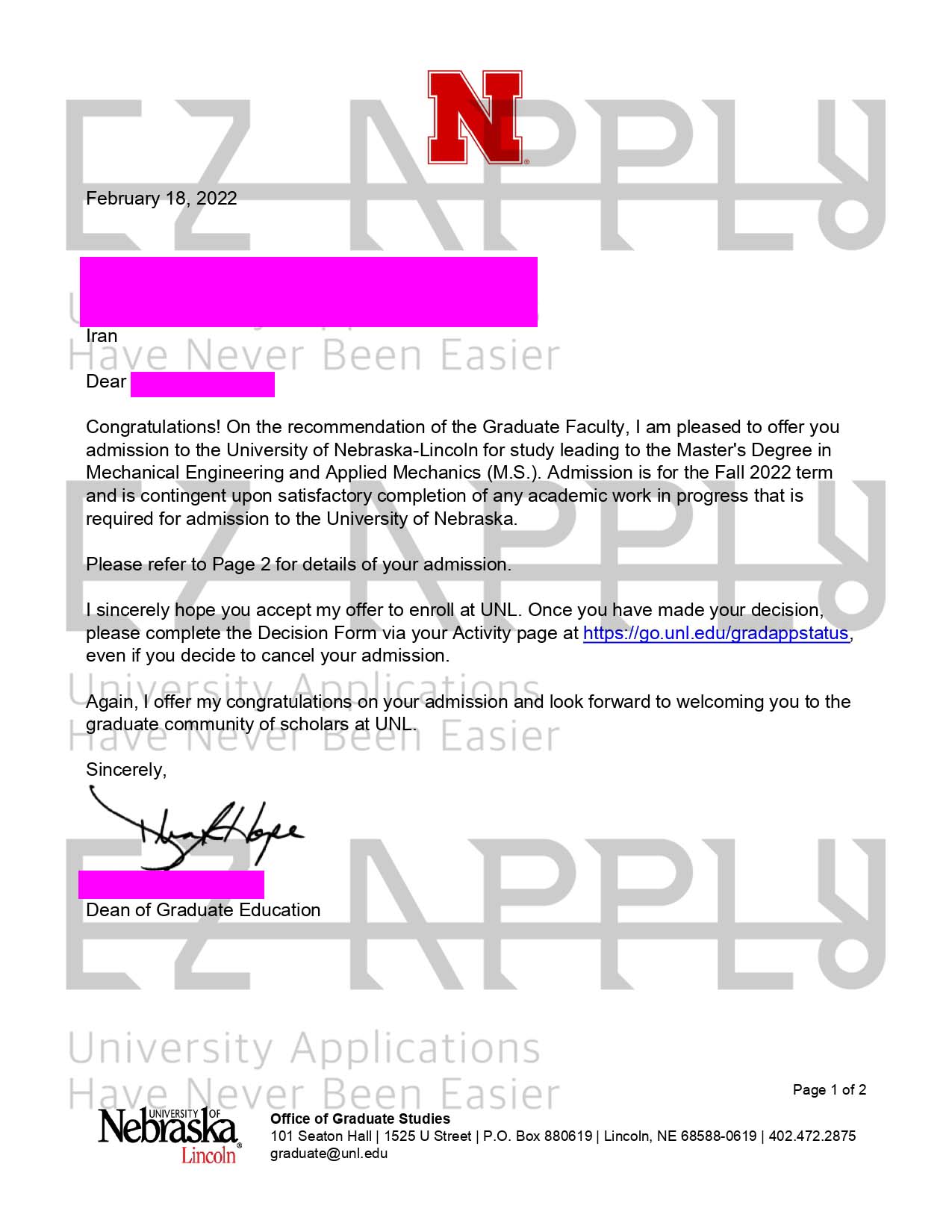 اخذ پذیرش توسط تیم «ایزی اپلای» در مقطع کارشناسی ارشد در رشته «مهندسی مکانیک» از دانشگاه «University of Nebraska»
