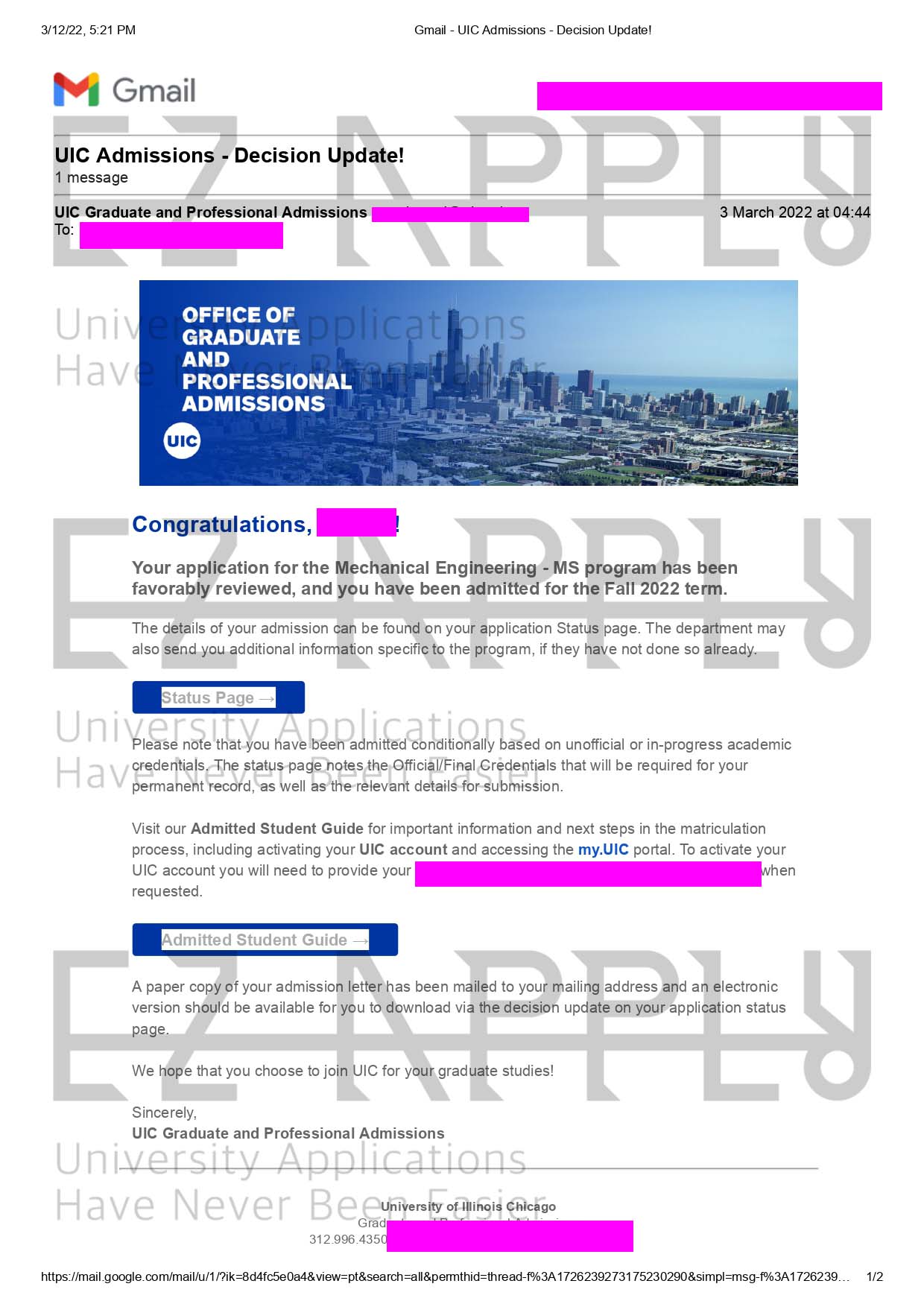 اخذ پذیرش توسط تیم «ایزی اپلای» در مقطع کارشناسی ارشد در رشته «مهندسی مکانیک» از دانشگاه «University of Illinois Chicago»