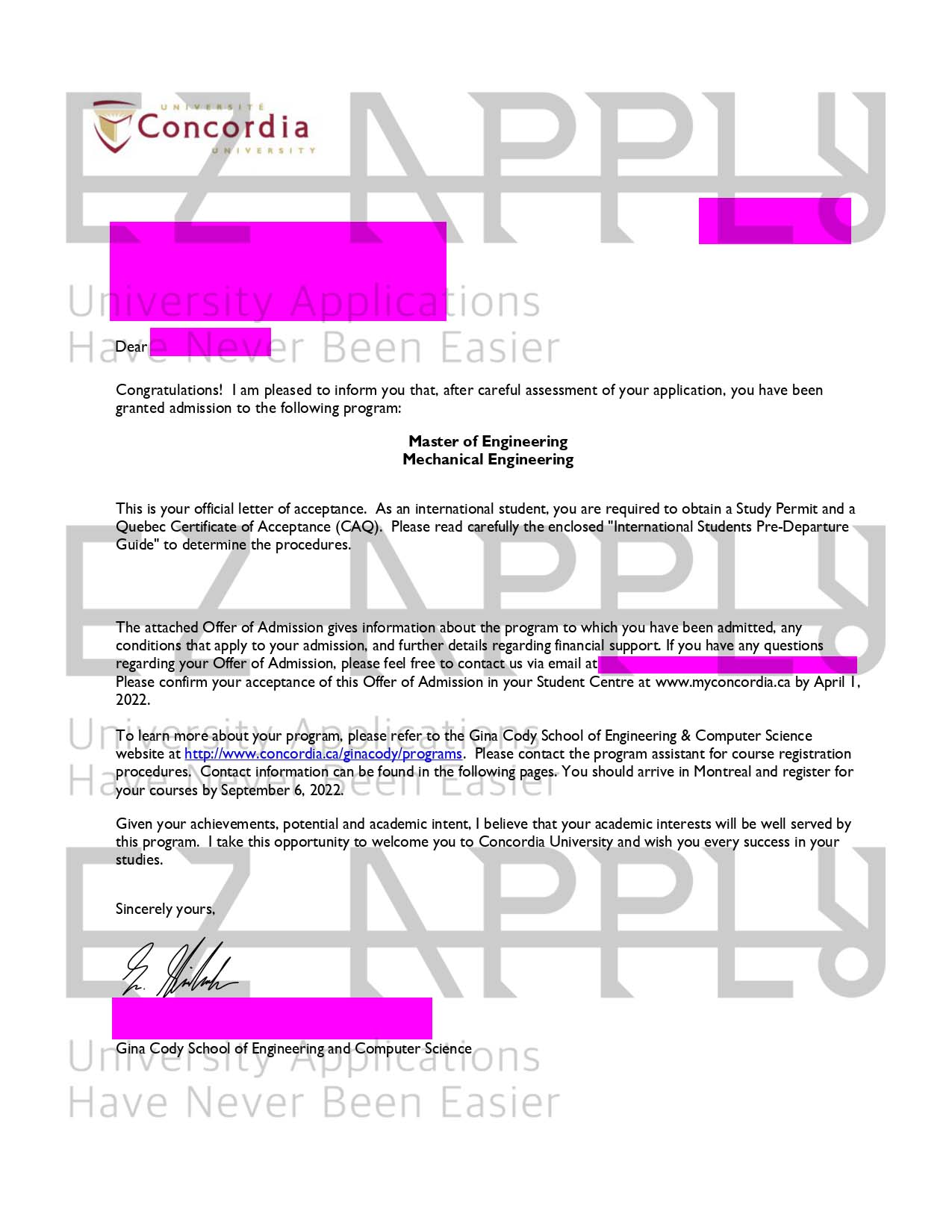 اخذ پذیرش توسط تیم «ایزی اپلای» در مقطع کارشناسی ارشد مهندسی در رشته «مهندسی مکانیک» از دانشگاه «Concordia University»