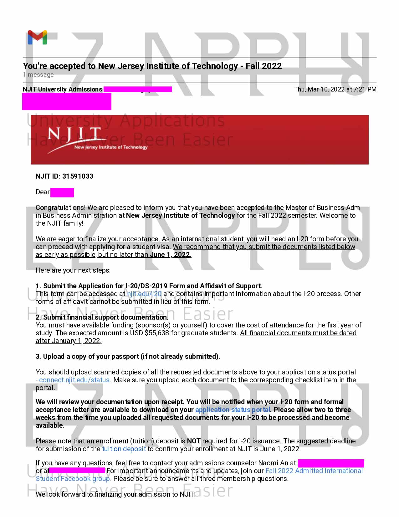 اخذ پذیرش توسط تیم «ایزی اپلای» در مقطع کارشناسی ارشد در رشته «مدیریت بازرگانی» از دانشگاه «New Jersey Institute of Technology University»