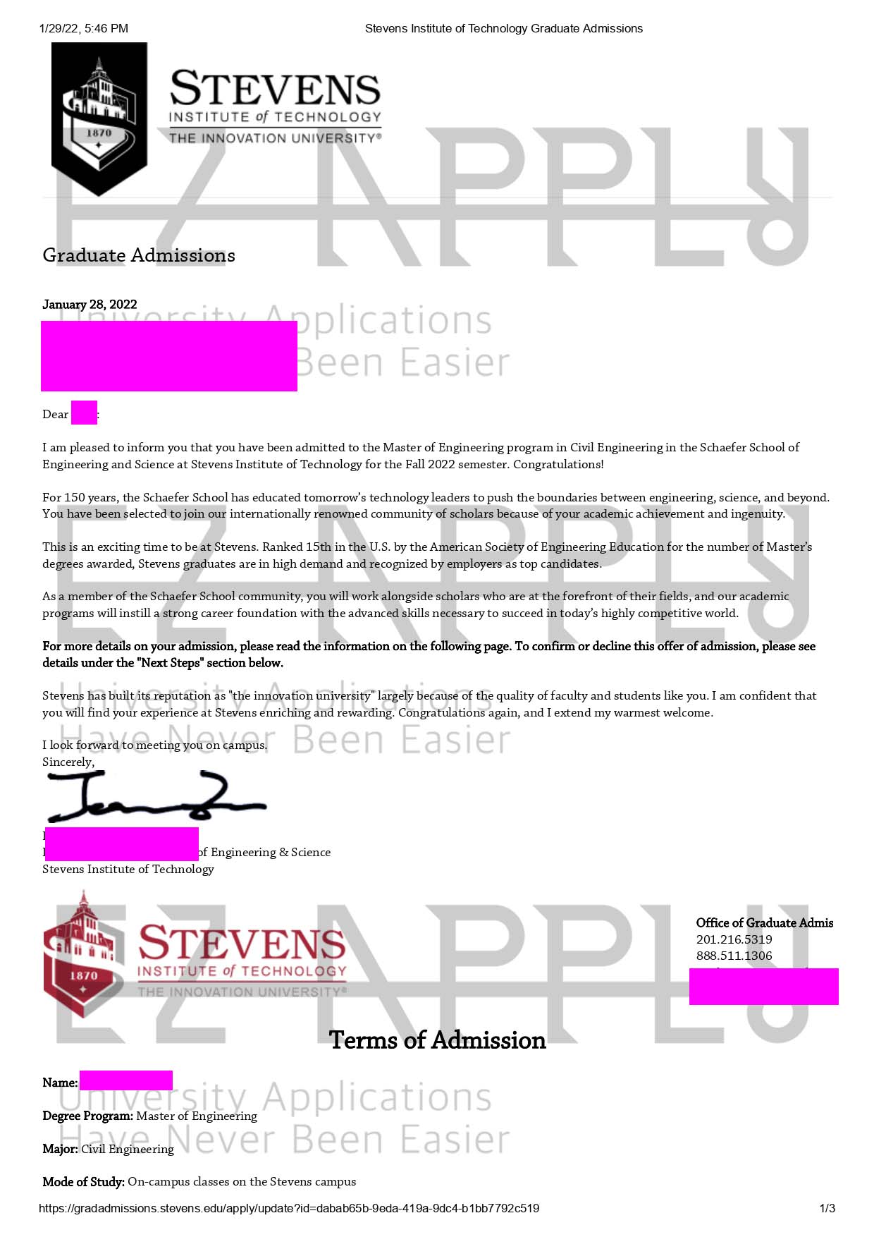 اخذ پذیرش توسط تیم «ایزی اپلای» در مقطع کارشناسی ارشد در رشته «مهندسی عمران» از دانشگاه «Stevens Institute of Technology»