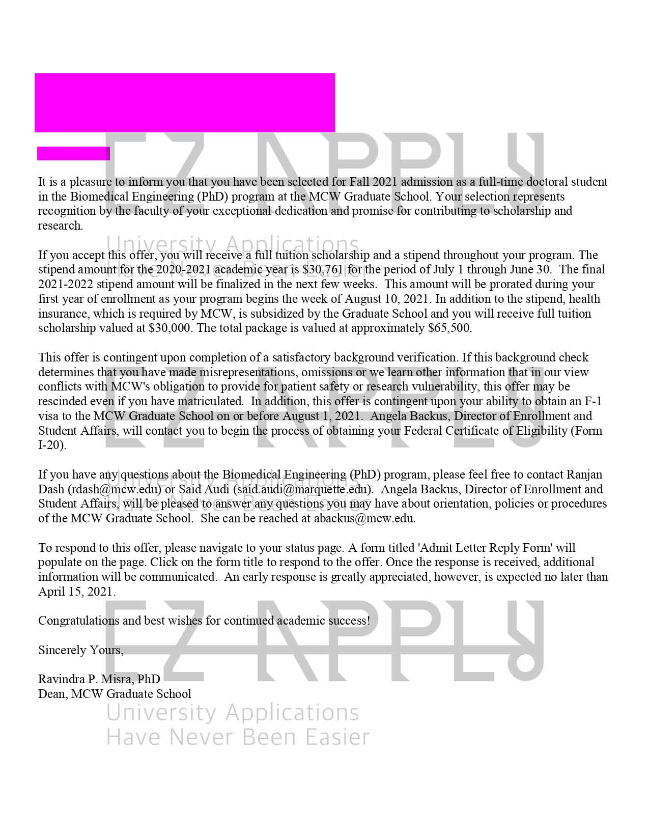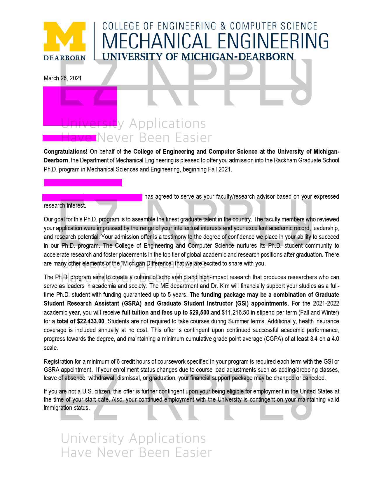 - اخذ پذیرش فول فاند توسط تیم «ایزی اپلای» در مقطع دکتری در رشته «مهندسی مکانیک» از دانشگاه «Michigan-Dearborn» در آمریکا برای ترم پاییز 2021