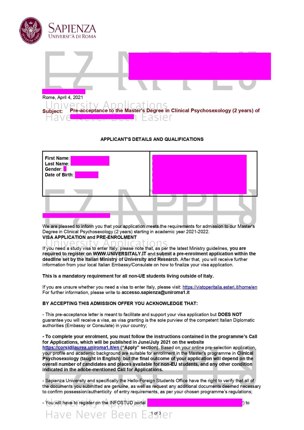 - اخذ پذیرش توسط تیم «ایزی اپلای» در مقطع کارشناسی ارشد در رشته «روانشناسی بالینی» از «Sapienza» در ایتالیا برای ترم پاییز 2021