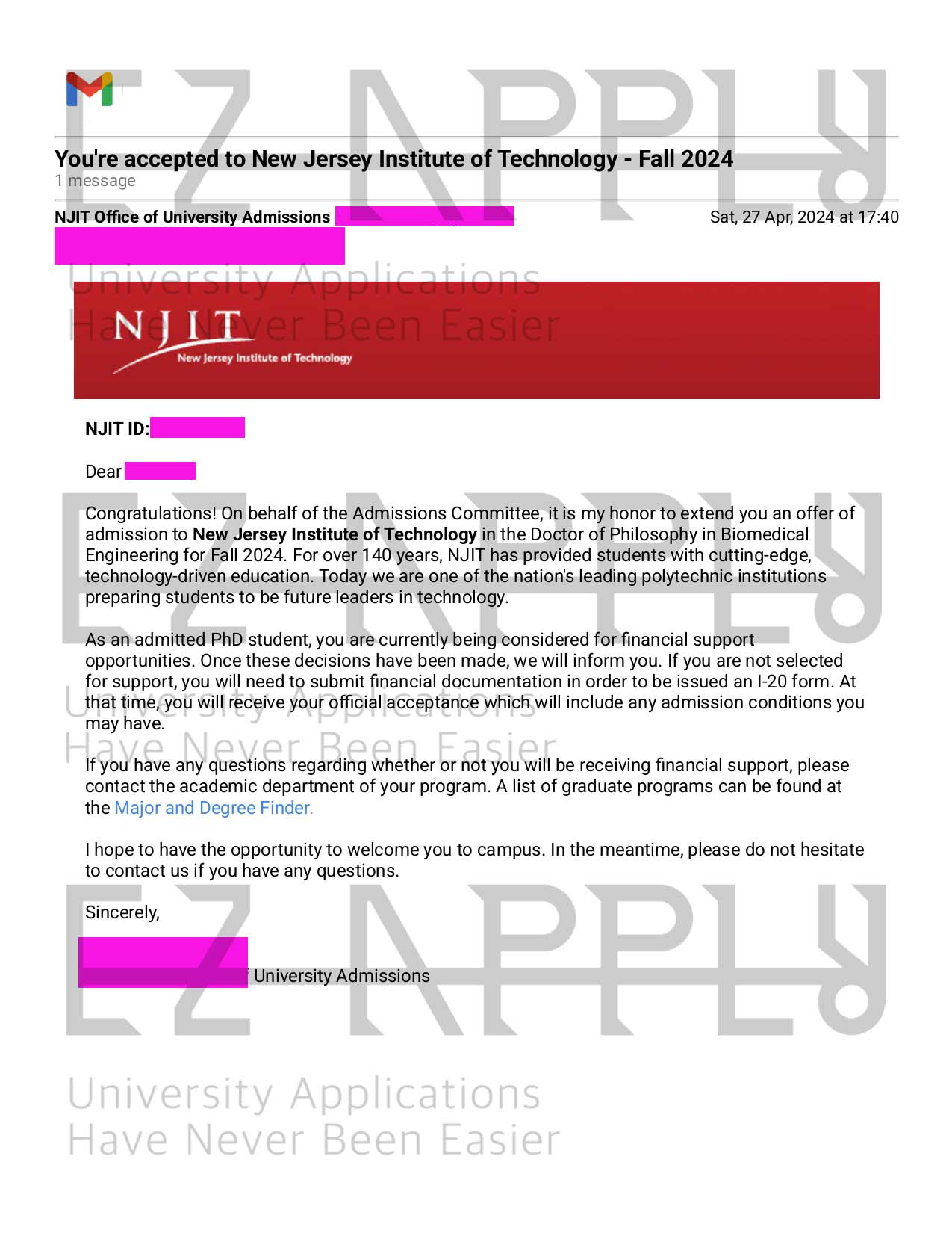 ادمیـشن اخذ شده توسط تیم ایزی اپلای در مقطع «دکتری» در رشته «Biomedical Engineering» از New Jersey Institute of Technology درآمریکا برای پاییز 2024
