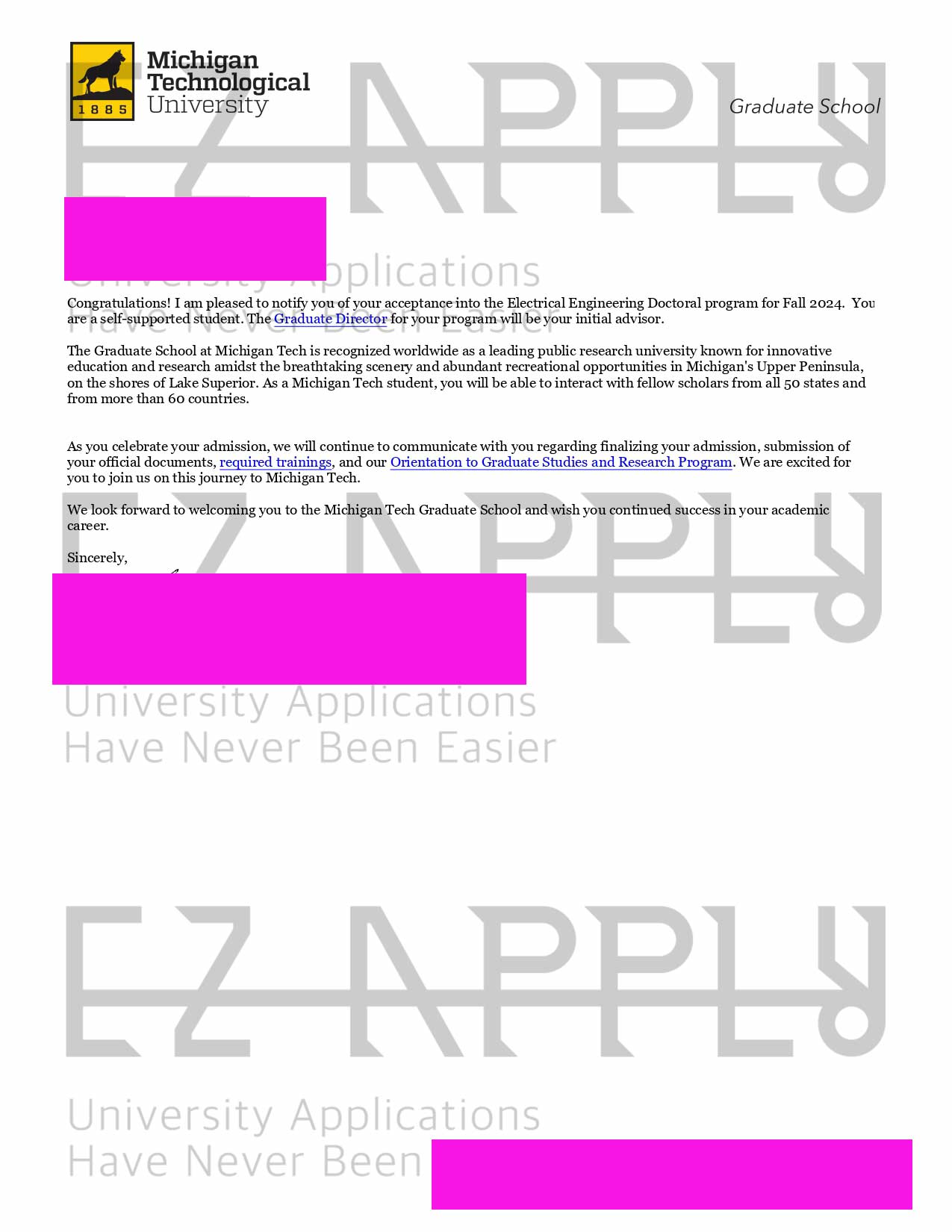 ادمیـشن اخذ شده توسط تیم ایزی اپلای در مقطع «دکتری» در رشته «Electrical Engineering» از Michigan Technological University در آمریکا برای پاییز 2024
