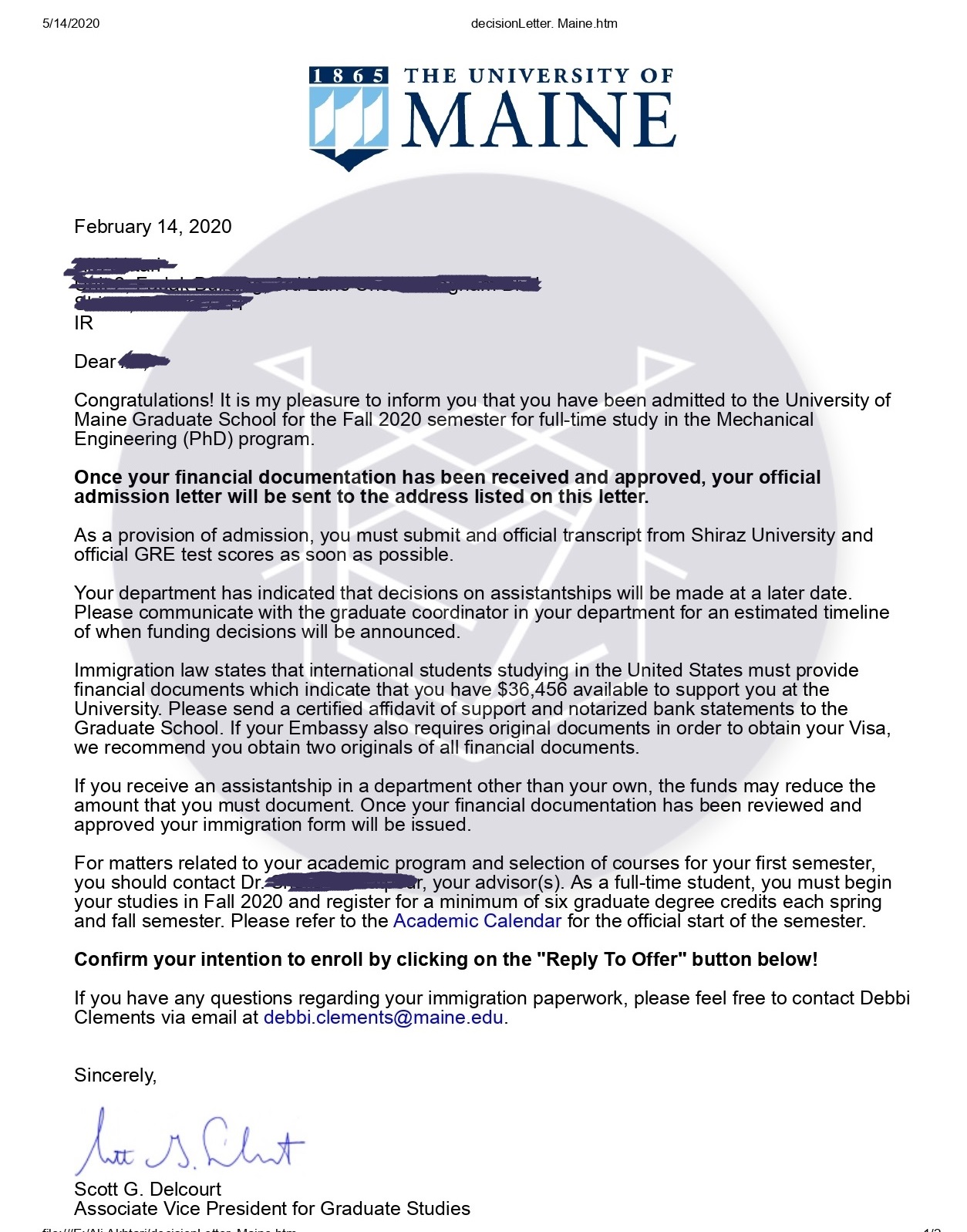 اخذ پذیرش توسط تیم «ایزی اپلای» در مقطع دکترا در رشته مهندسی مکانیک از دانشگاه « Maine» آمریکا برای ترم پاییز 2020