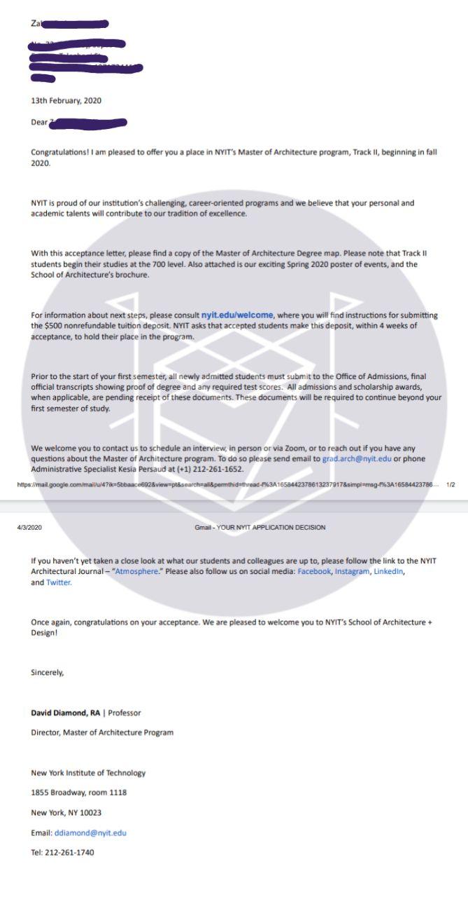 - اخذ پذیرش توسط تیم «ایزی اپلای» در مقطع کارشناسی ارشد رشته «معماری» از دانشگاه «New York Tech» آمریکا برای ترم پاییز 2020