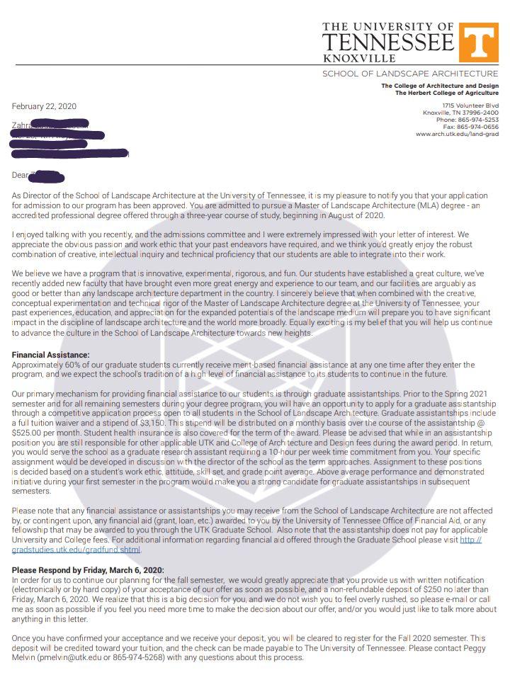 - اخذ پذیرش توسط تیم «ایزی اپلای» در مقطع کارشناسی ارشد رشته «معماری منظر» از دانشگاه «Tennessee Knoxville» آمریکا برای ترم پاییز 2020
