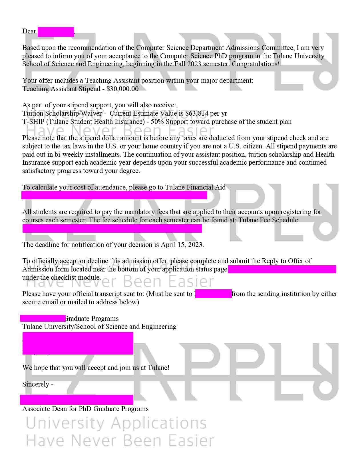 پذیرش فول فاند اخذ شده توسط تیم ایزی اپلای در مقطع «دکتری» در رشتهی «علوم کامپیوتر» از «Tulane University» در آمریکا برای پاییز 2023